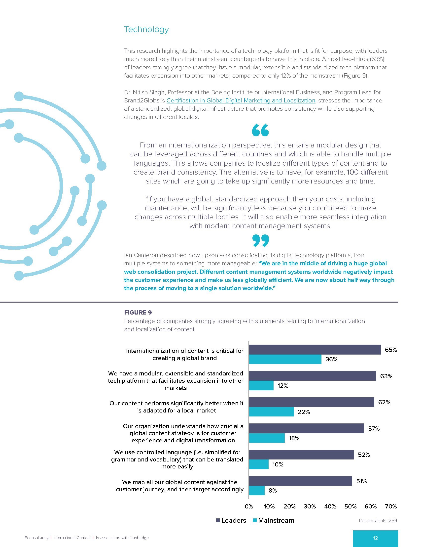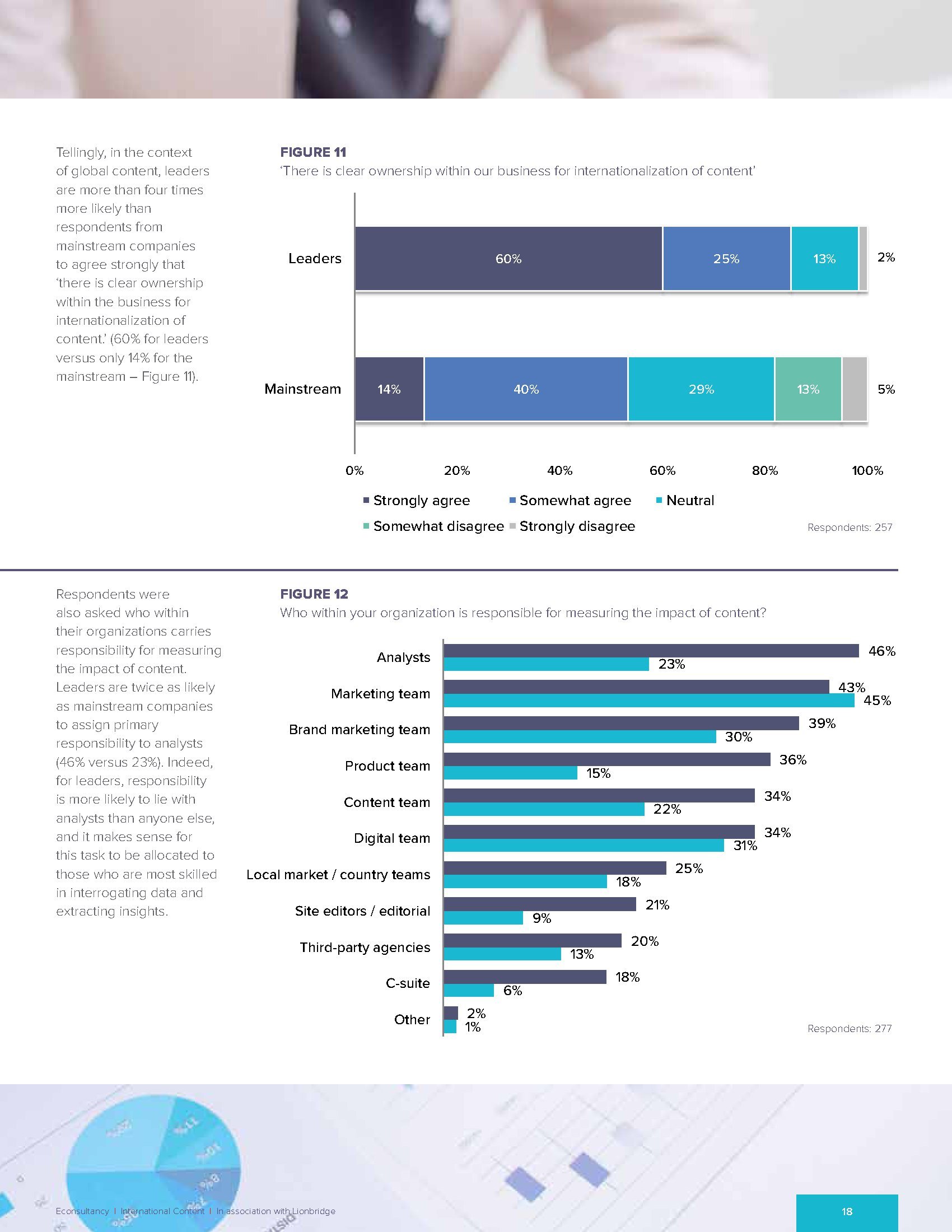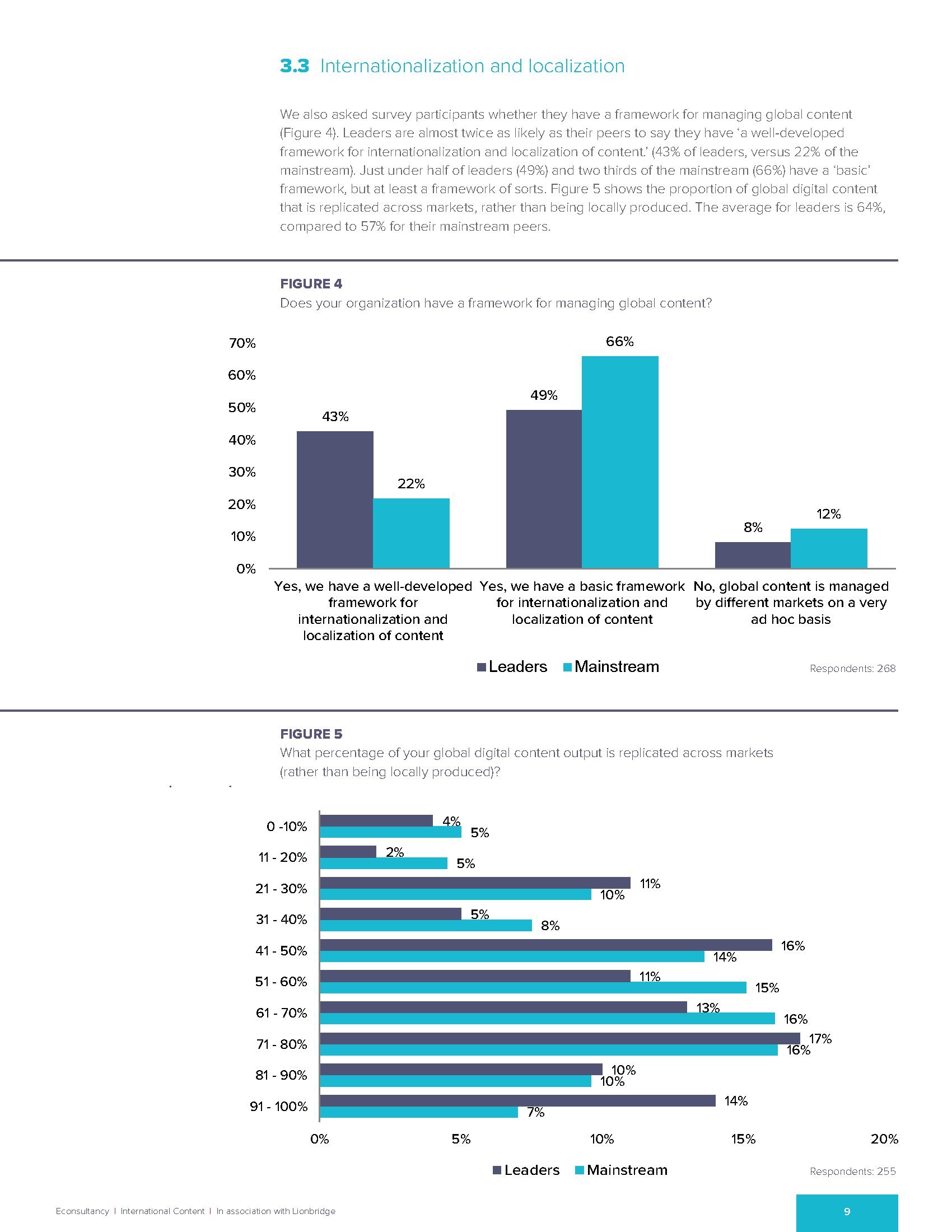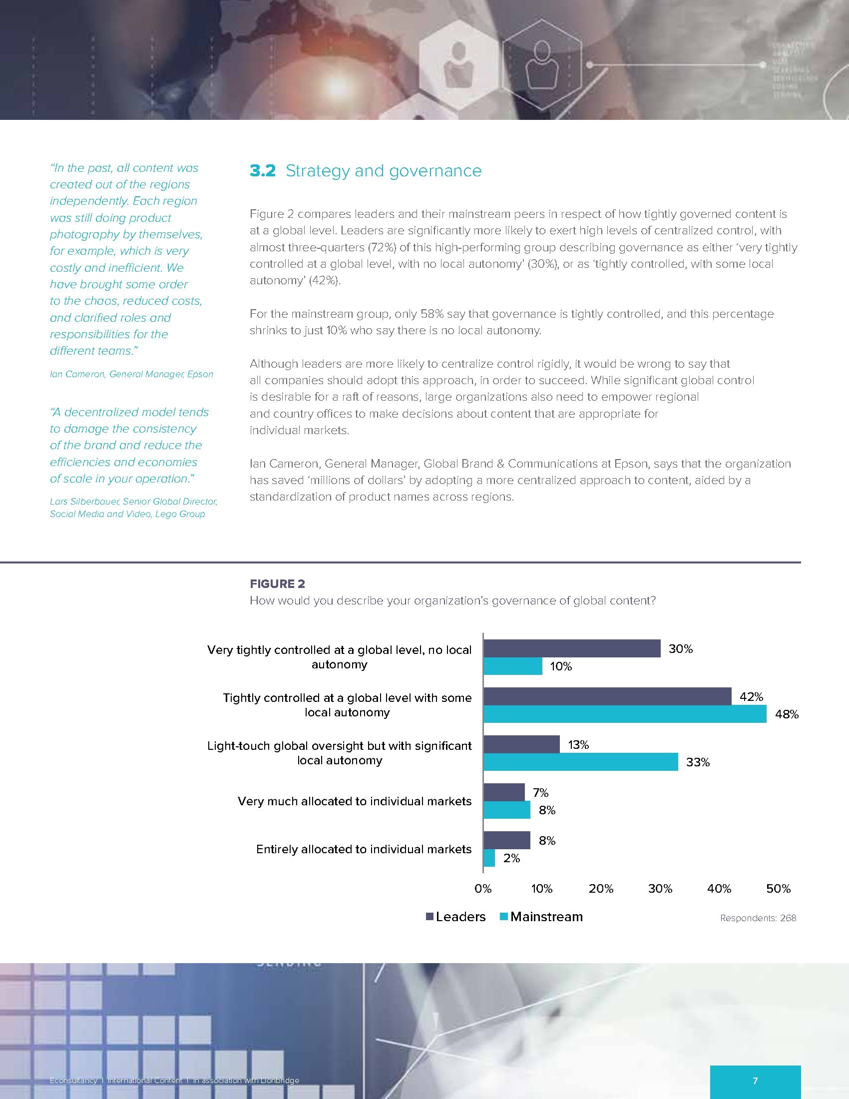 从整体来看,只有58%的企业能集中控制全球内容,而没有地方自治的企业仅占10%。国际化和地方内容都有完善框架的领袖企业比例是平均水平的两倍(43% vs. 22%)。