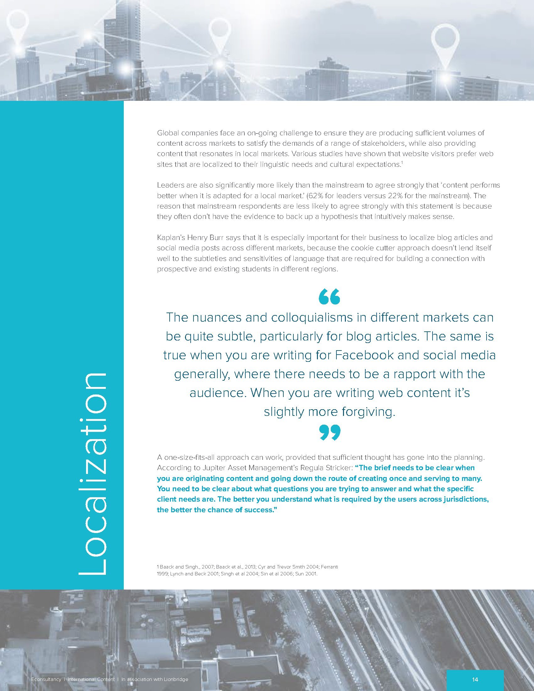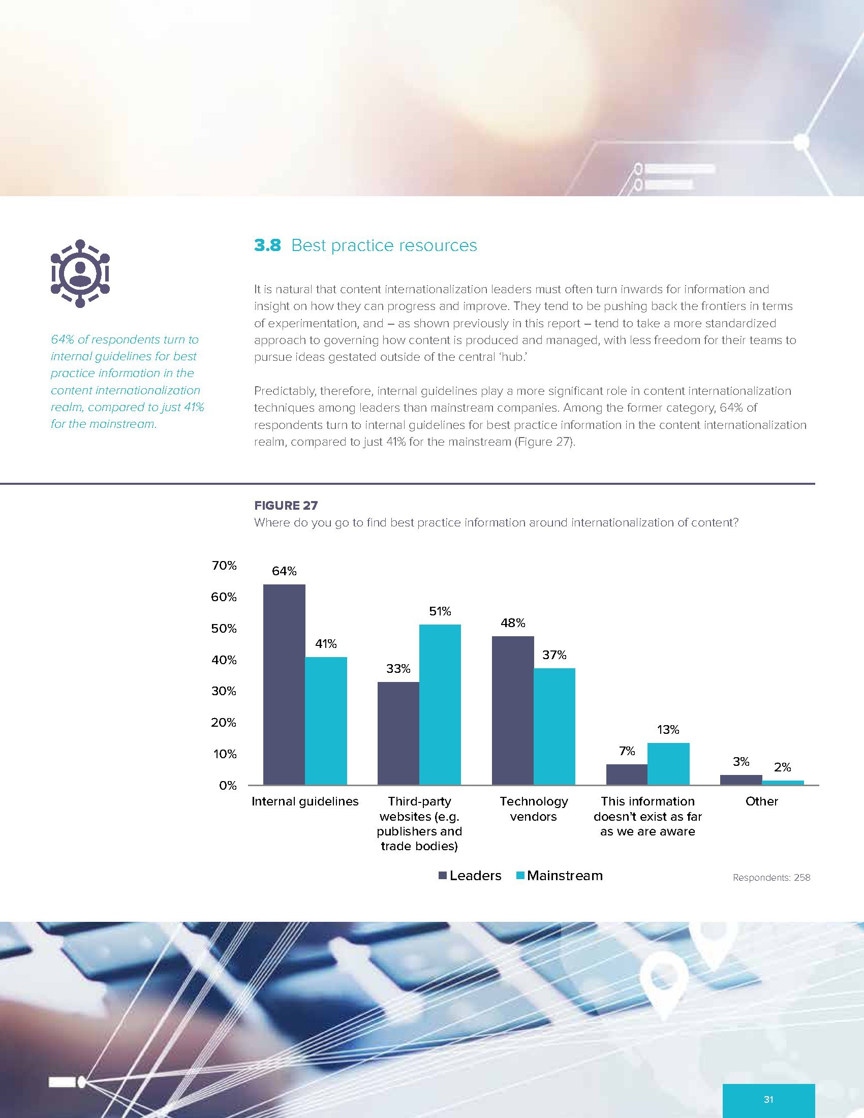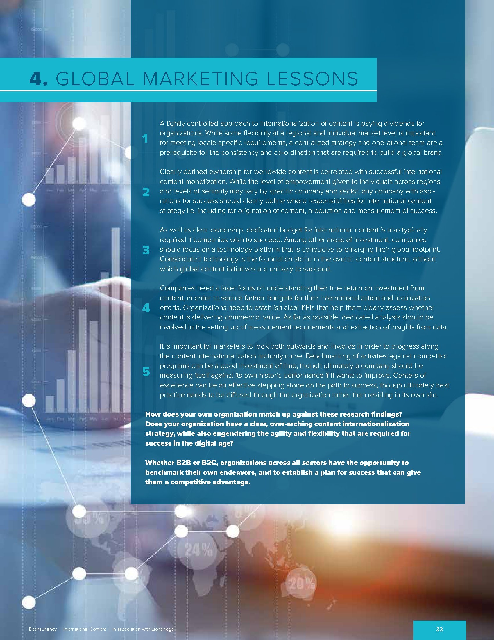 从整体来看,只有58%的企业能集中控制全球内容,而没有地方自治的企业仅占10%。国际化和地方内容都有完善框架的领袖企业比例是平均水平的两倍(43% vs. 22%)。