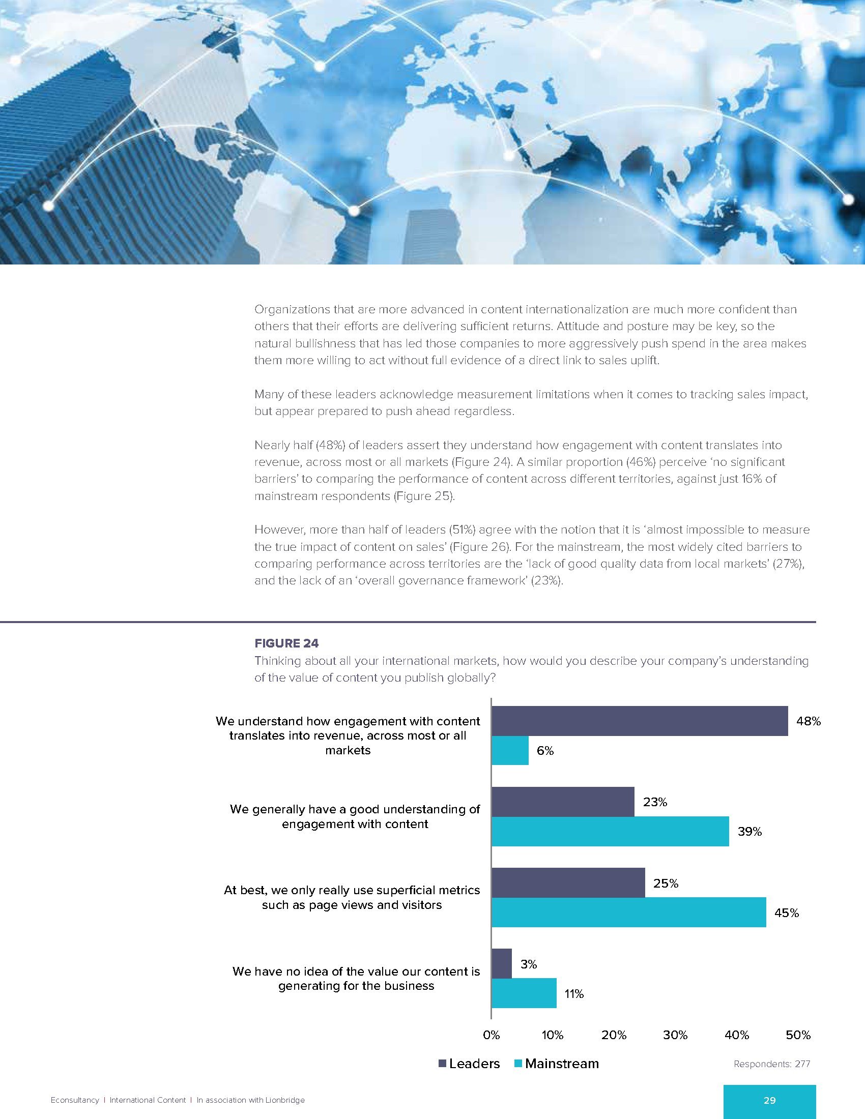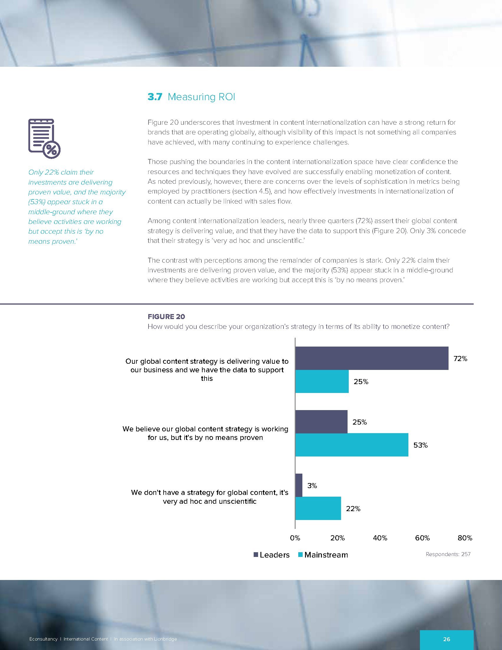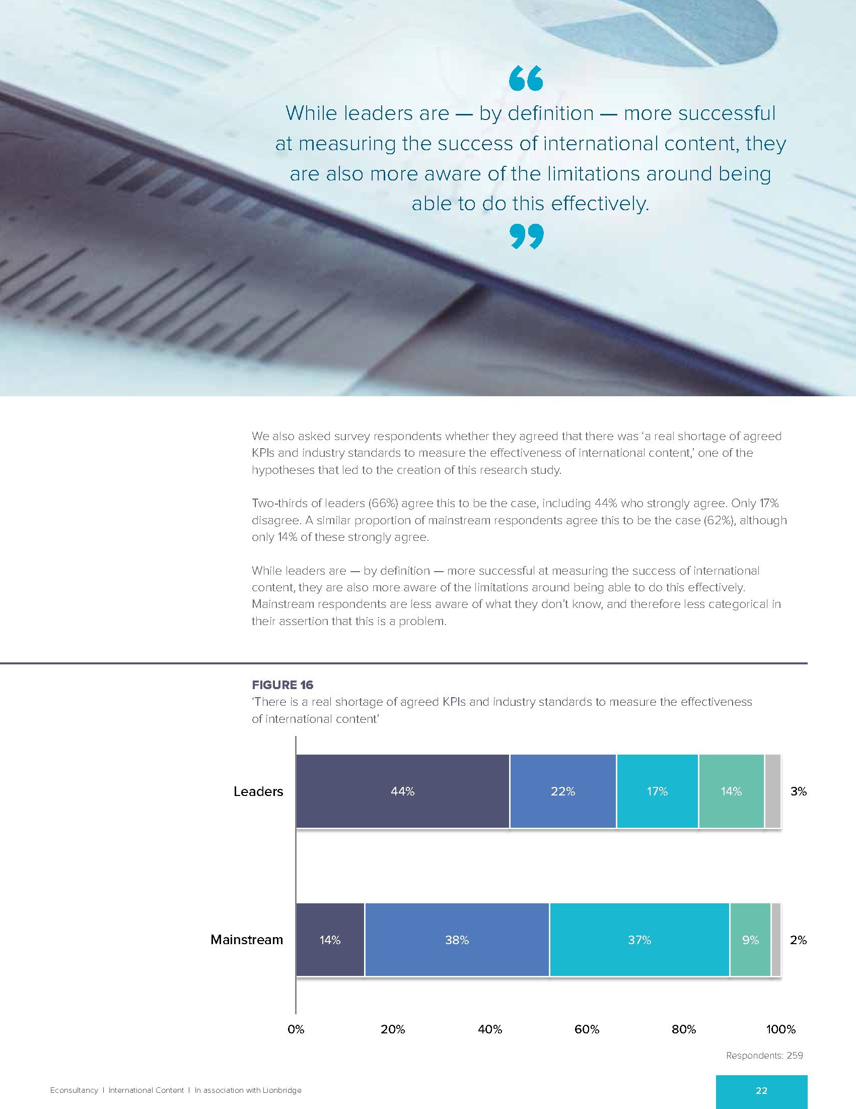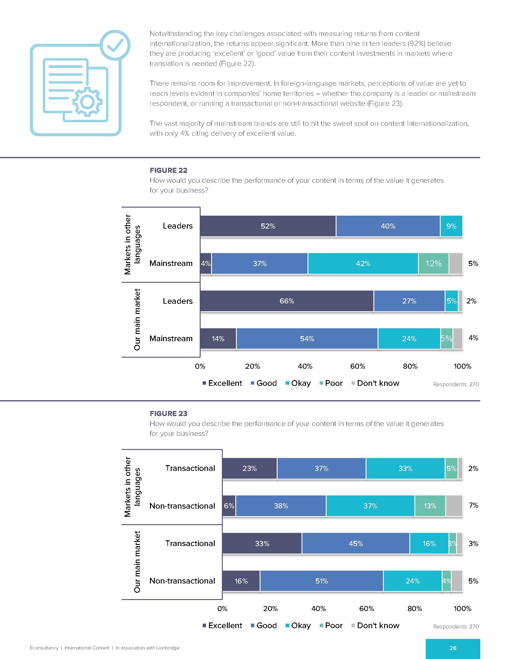 在领袖企业中,72%认为其国际化内容策略传递了价值,并且有支持这一观点的数据。相反,22%的普通企业这么认为。