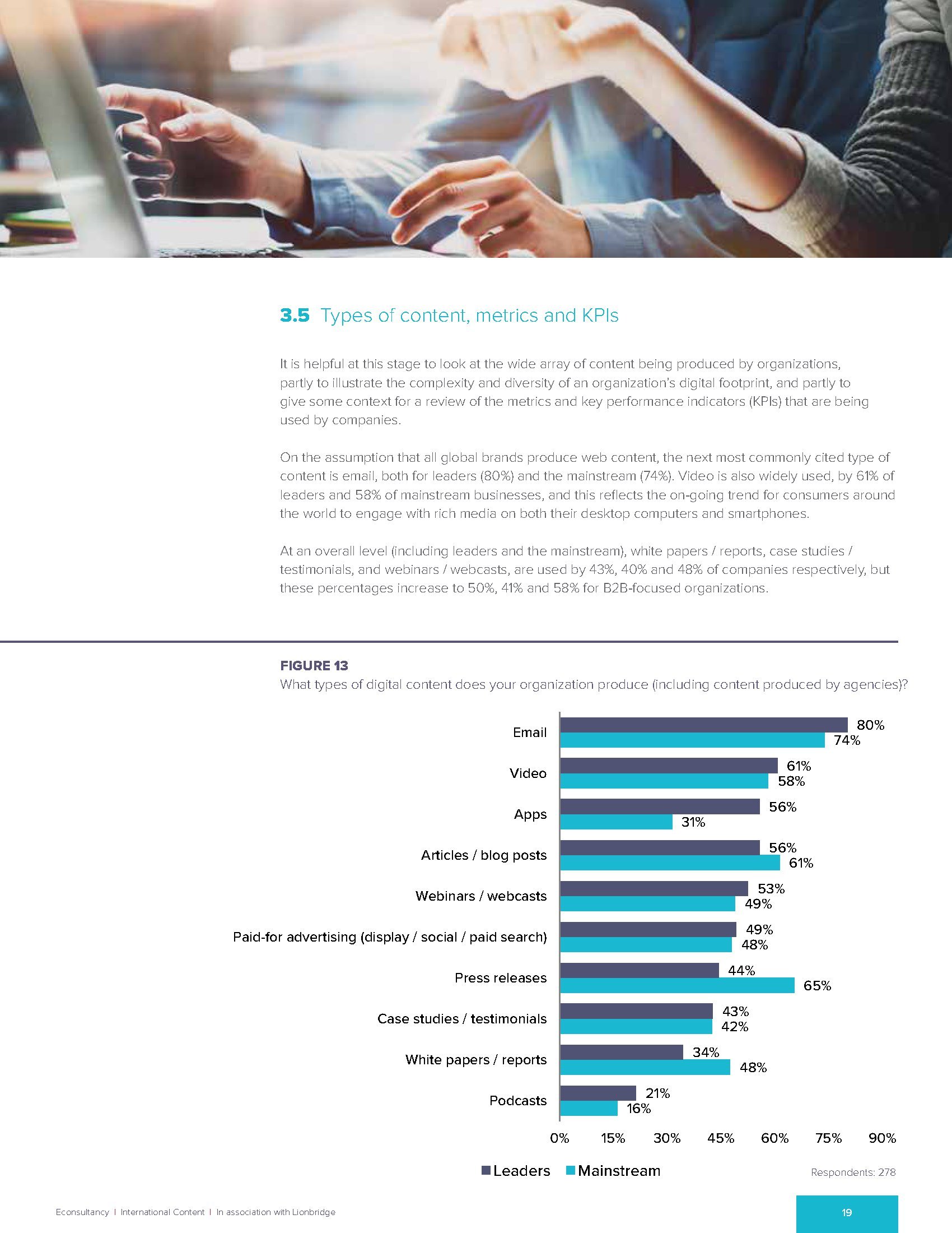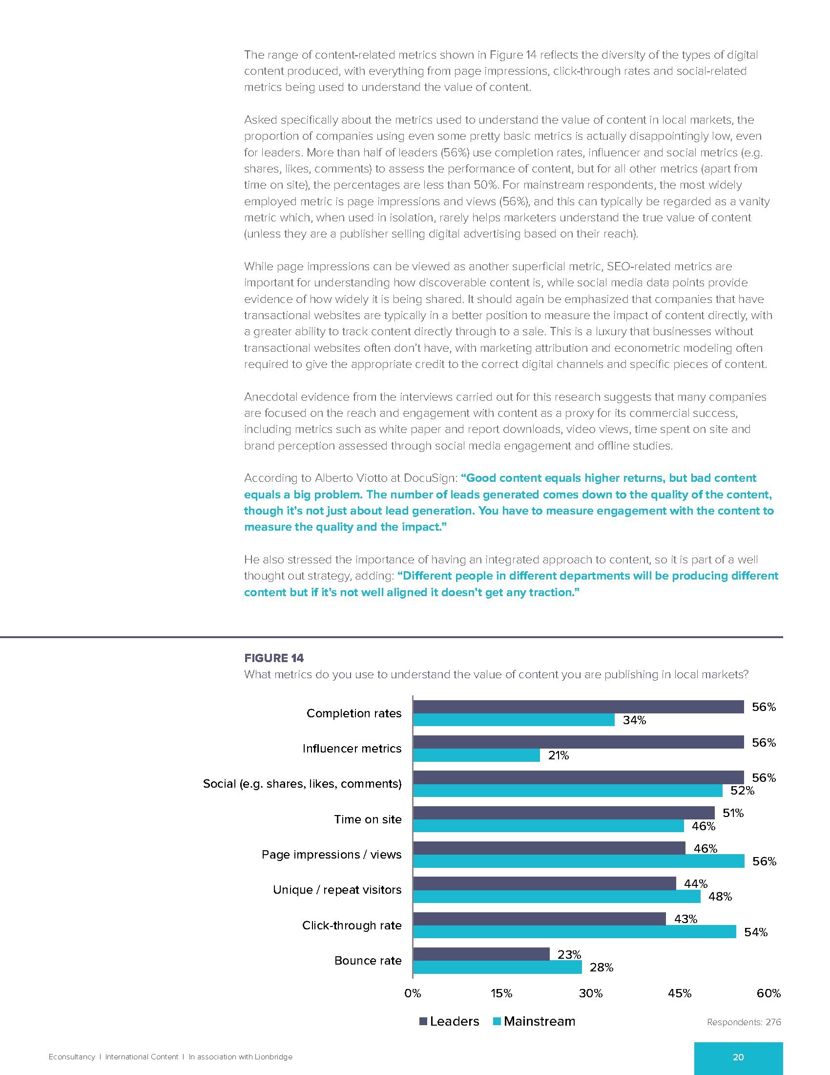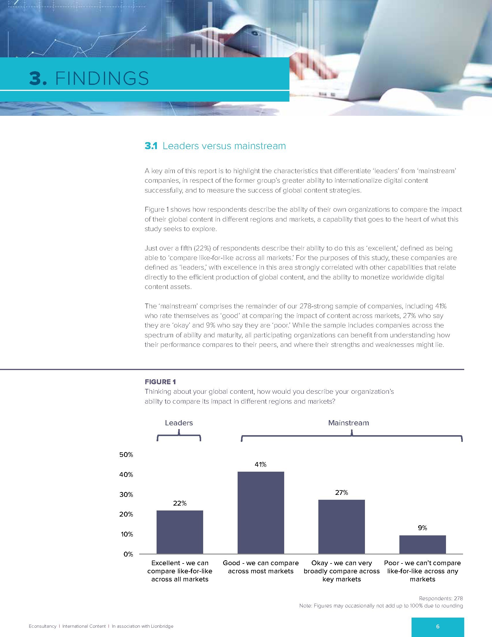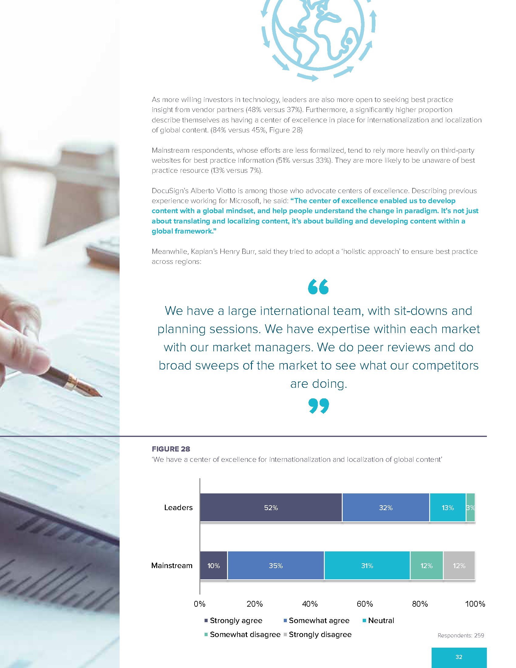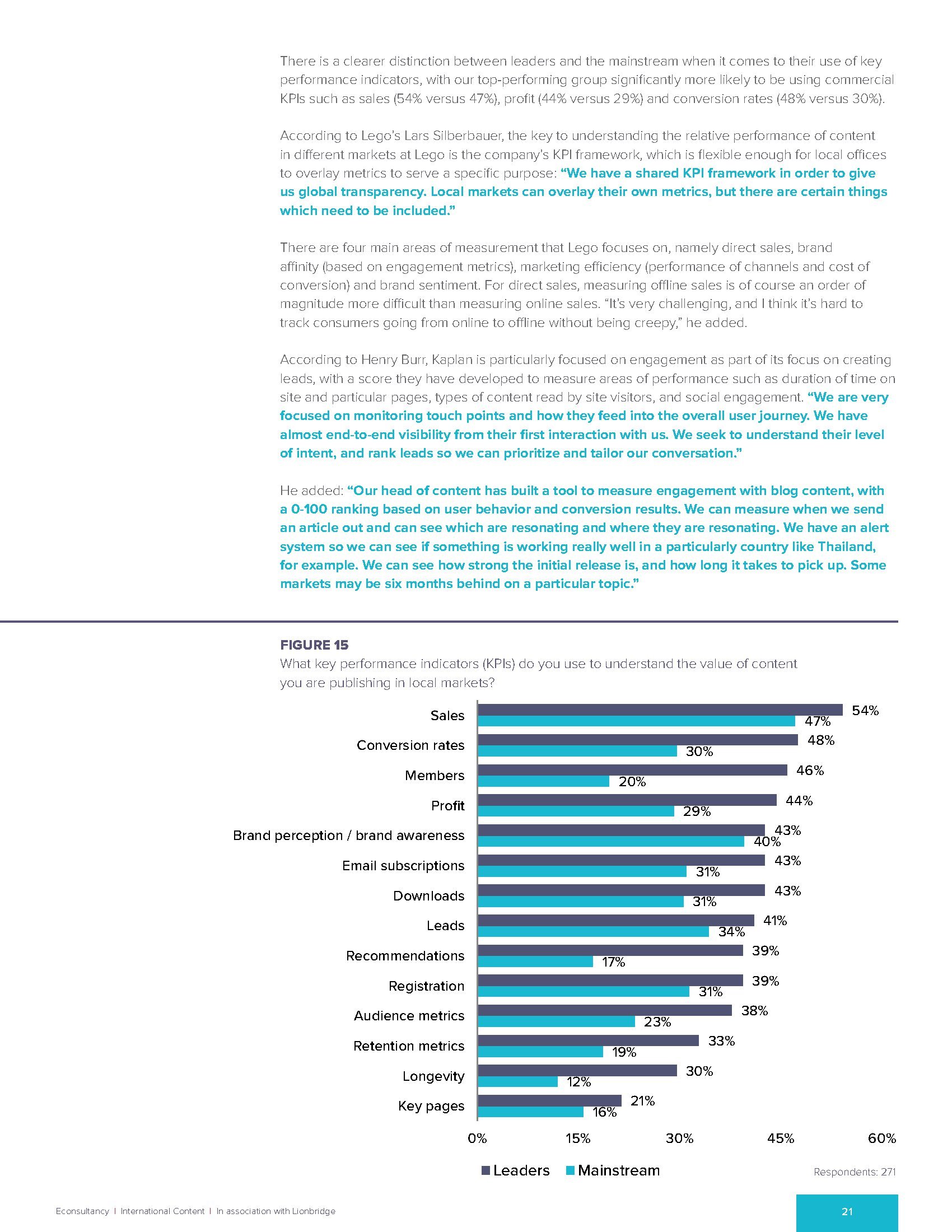 在领袖企业中,72%认为其国际化内容策略传递了价值,并且有支持这一观点的数据。相反,22%的普通企业这么认为。