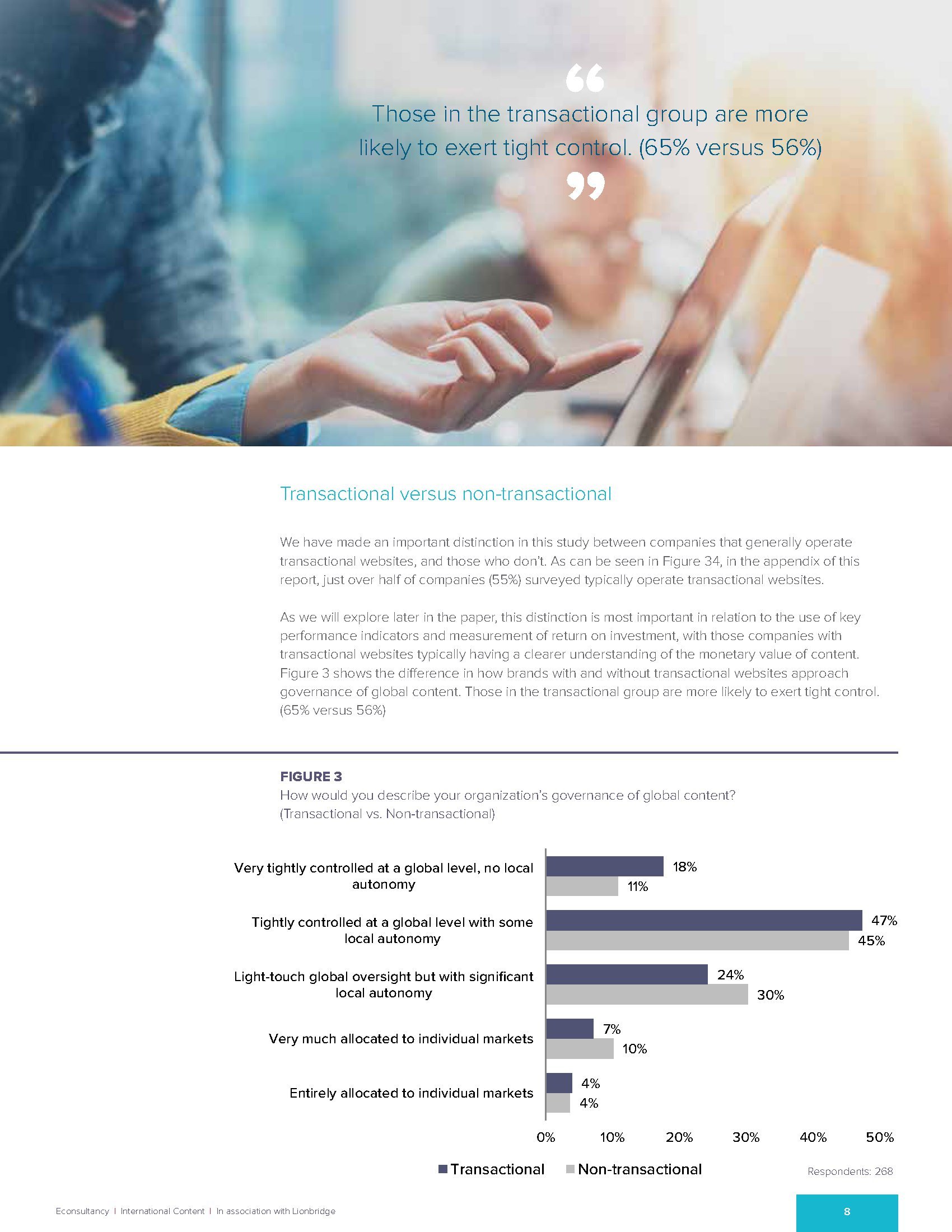 领袖企业比其他企业更有可能高度集中控制内容。72%的领袖企业高度控制全球营销内容,没有地方自治(30%)或部分地方自治(42%)。