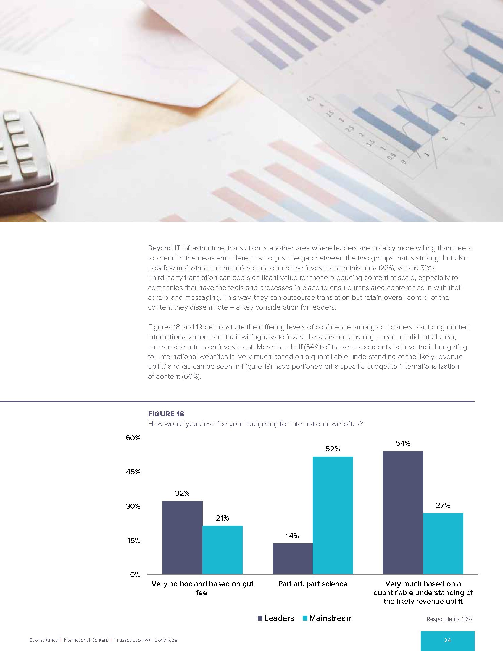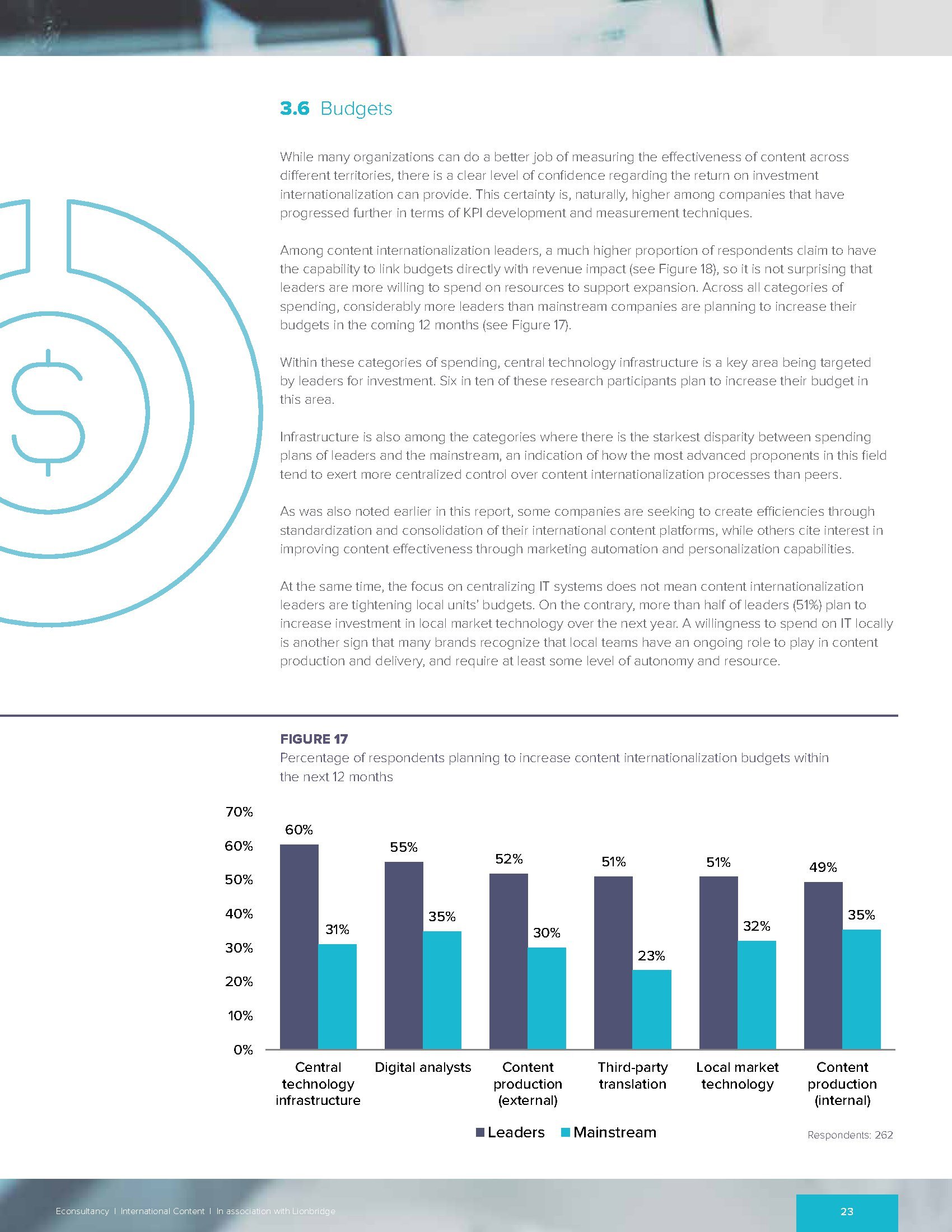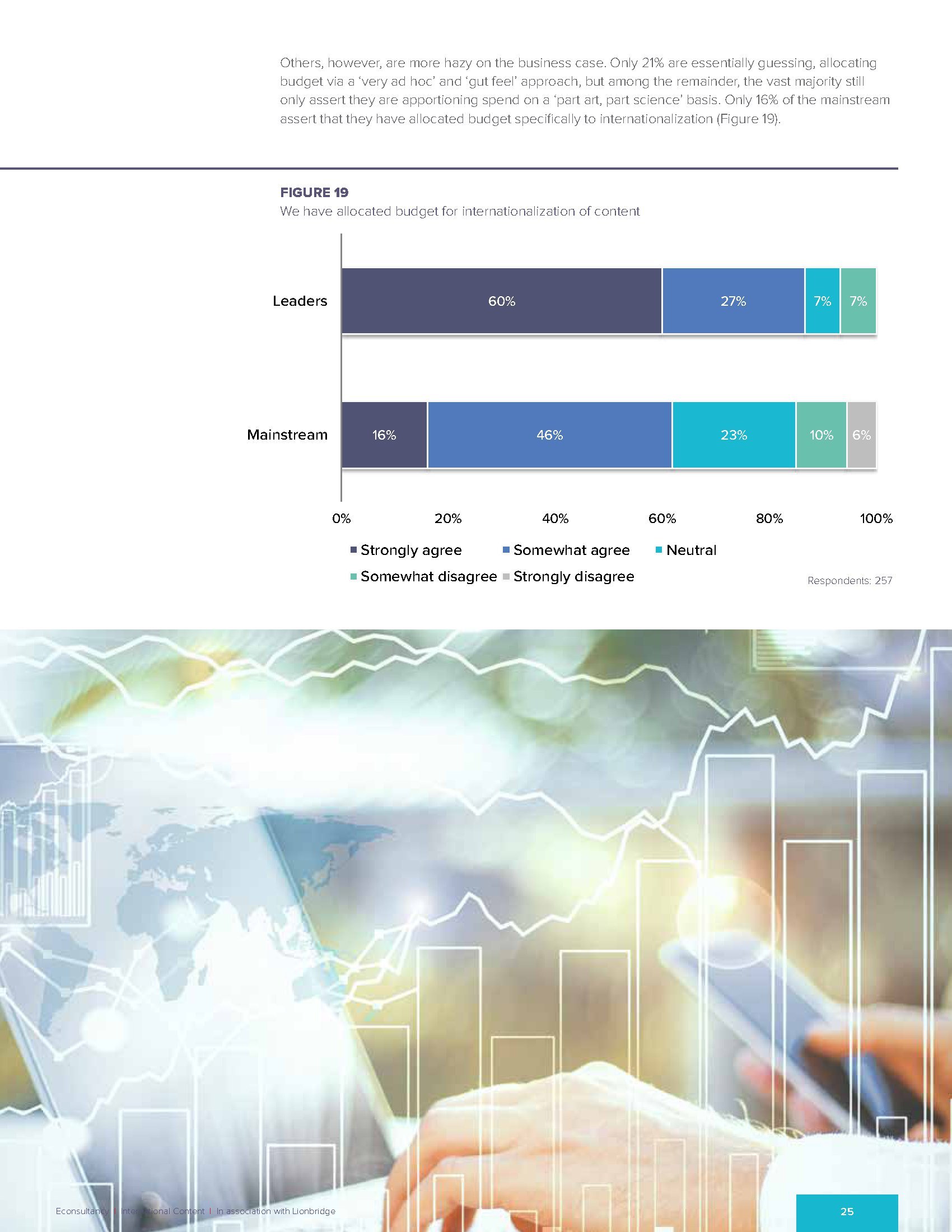 超过半数领袖企业认为他们的国际网站预算是基于收入增长的量化理解(54%),60%的企业有特定的内容国际化预算。
