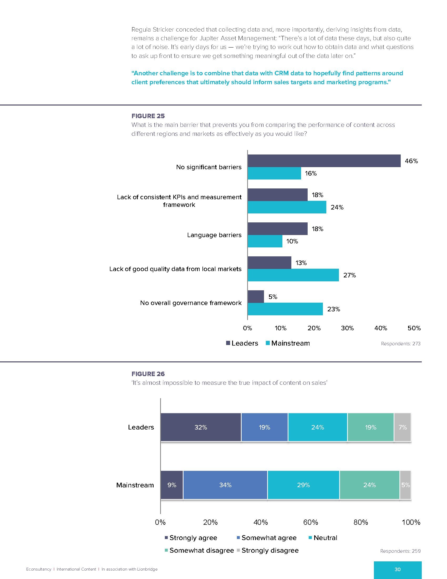 领袖企业也更可能将测量内容营销效果作为分析师的首要任务(46% vs. 23%)。