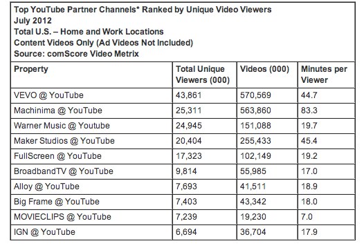 在YouTube 的合作伙伴中,7月VEVO 的独立观众数量为4390万,其次依次是游戏频道Machinima (2530万)、Warner Music (2490万)和Maker Studios (2040万)。在YouTube 的十大合作伙伴中,Machinima 的用户参与度最高 (每位观众平均观看83分钟视频),其次是Maker Studios (45分钟),VEVO播放的视频最多 (5.71亿段),其次是Machinima (5.64亿段)。