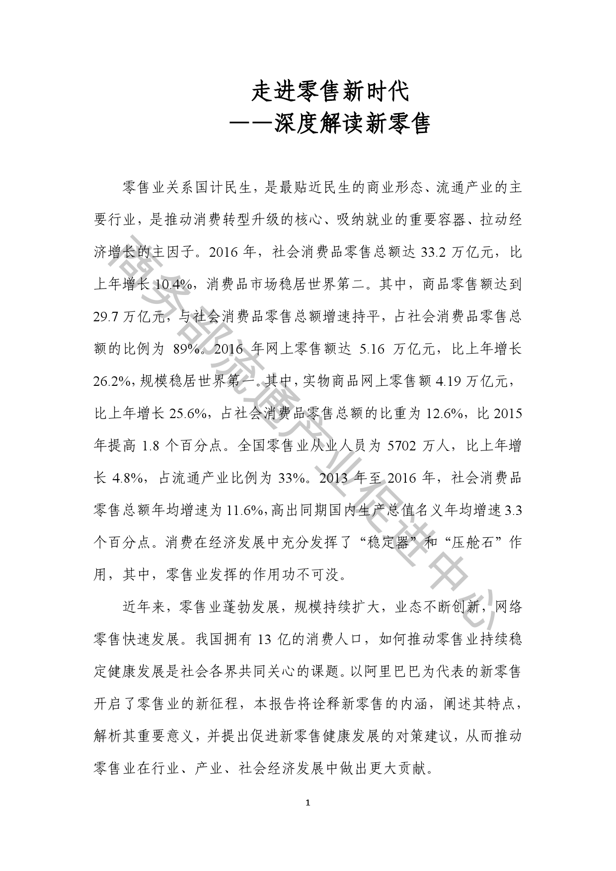 商务部流通产业促进中心发布了《走进零售新时代——深度解读新零售》报告,报告共分五个部分,分析了新零售产生的背景,诠释其内涵,阐述其特点,解析其意义,并提出促进新零售健康发展的对策建议。