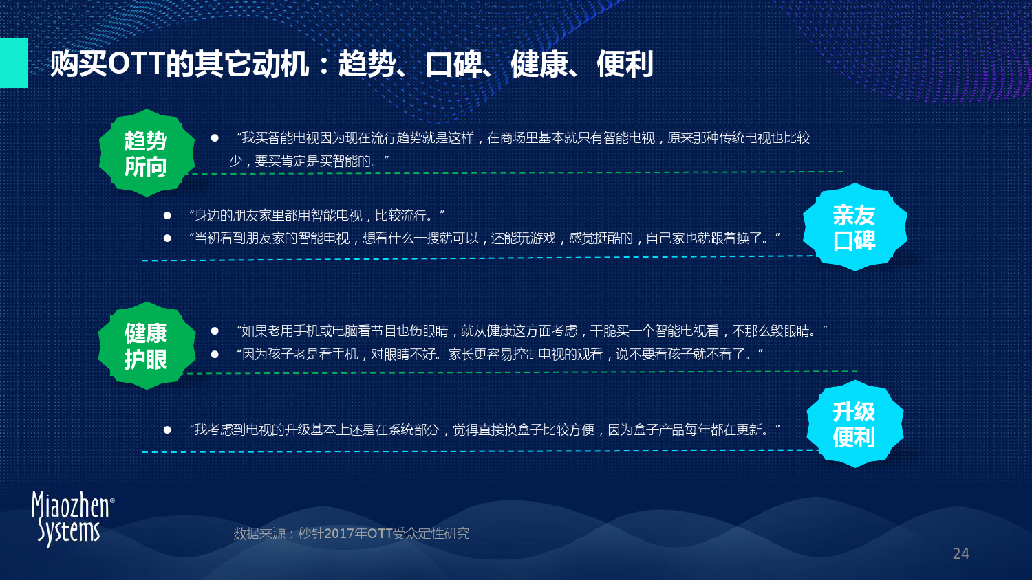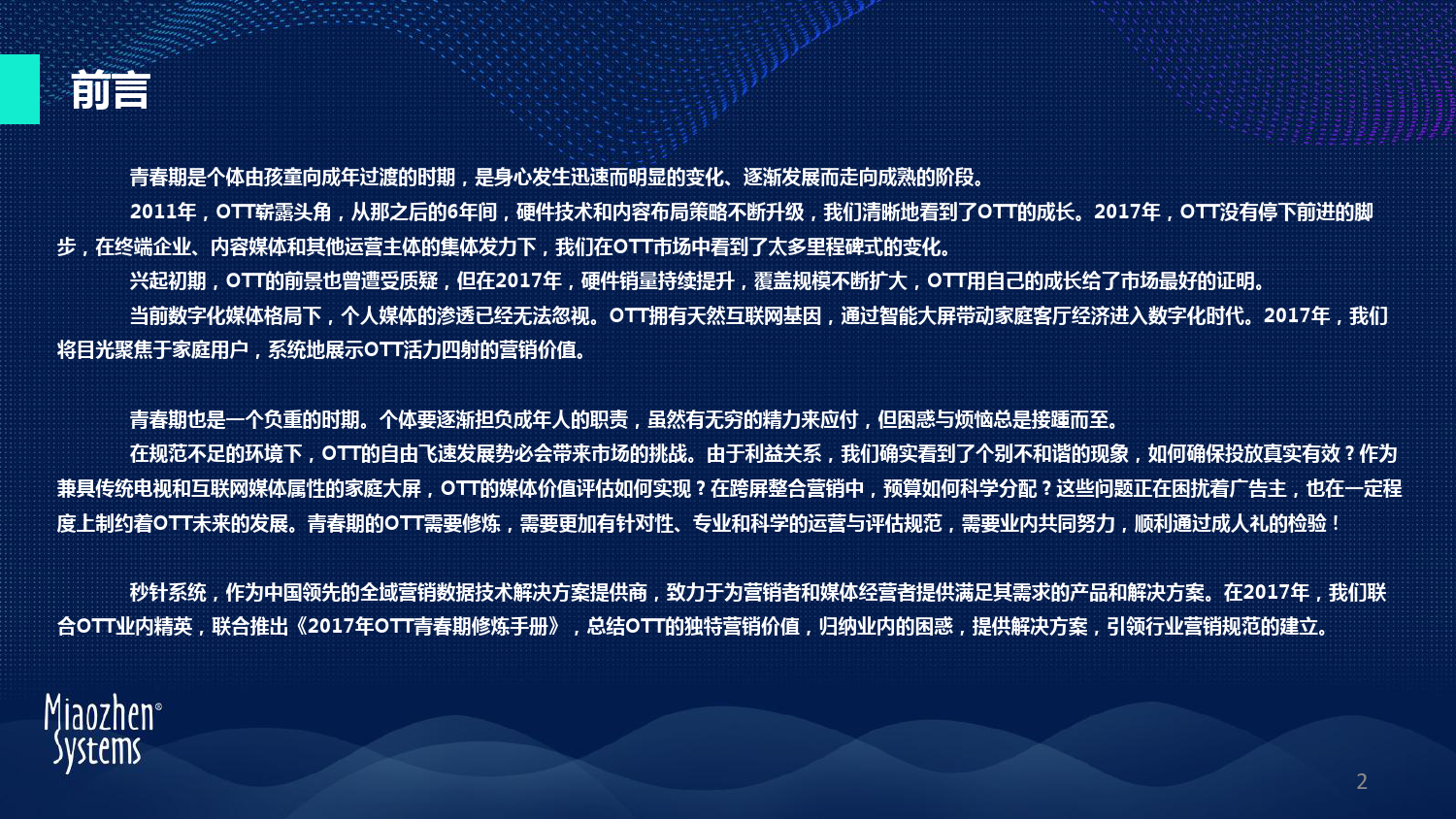 秒针系统:2017年OTT青春期修炼手册(162页) 完整版获取PDF版微信扫描下面二维码 199IT知识星球(原小密圈)已有1400+资深用户、3000+份最新最好的行业文档,欢迎您的加入! 更多阅读:奥维云网:2017年中OTT运营大数据蓝皮书comScore:2018年OTT报告FreeWheel:2017年OTT设备和用户调查报告comScore:2020年OTT报告Dentsu:印度OTT报告秒针系统:2017年电子竞技行业研究报告勾正数据&当贝网络:2017年10月OTT行业报告勾正数据:2017年OTT行业发展报告奥维互娱:2020年国庆假期OTT大屏用户行为报告奥维云网:2018年4月OTT大屏用户行为月报奥维互娱:2020年9月OTT大屏用户行为月报奥维云网:2018年中国OTT发展预测报告勾正:2017年OTT行业发展报告(完整版)秒针系统:2015年移动视频的价值和整合应用白皮书MarketingCharts: 媒体高管把OTT视频看作付费电视的补充——而非取代