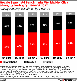 去年,近2/3的美国搜索广告收入来自移动设备。今年,移动的份额将达到70.0%,预计到2021年这个指数将达到80%。