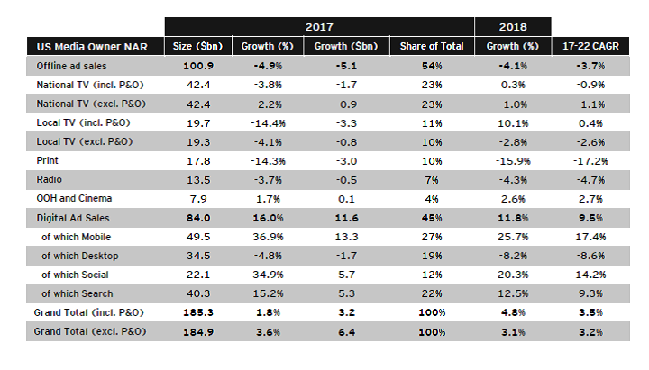 和2016年(5.9%)的强劲表现相比,今年的增速明显放缓。预计2018年美国媒体广告收入将增长4.8%。