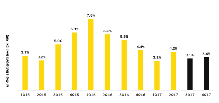 2017年第二季度,广告销售额增长4.2%,预计第三季度和第四季度的增速在3.5%左右。
