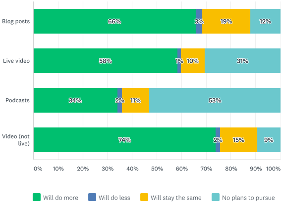 未来,47%的受访者将创作更多视频;53%的博主将发布更多帖子;61%的视频创作者将发布更多的视频;49%的播客将增加播客内容。