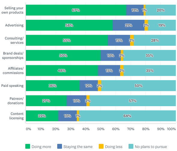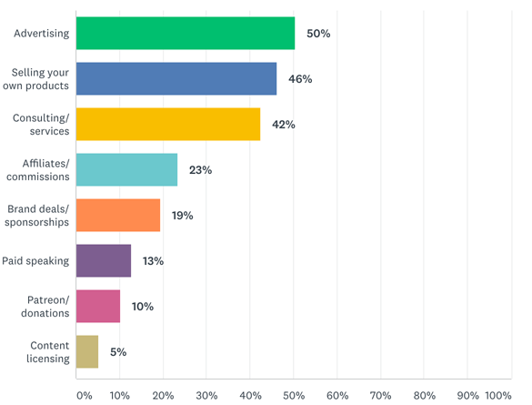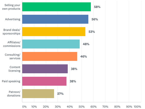 对于那些利用内容赚钱的创作者来说,广告是赚钱(50%)的最重要方式,其次是销售自己的产品(46%)和服务(42%)。