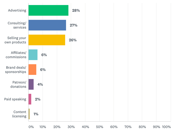 在选择最赚钱的一种方法时,广告首当其冲。服务和产品紧随其后。事实上,81%的创作者认为这三者之一构成了最大的收入来源。