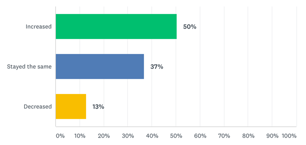 半数创作者表示,现在的收入比12个月之前更高了。只有13%表示收入有所下降。收入增长的播客比例最高(59%)。