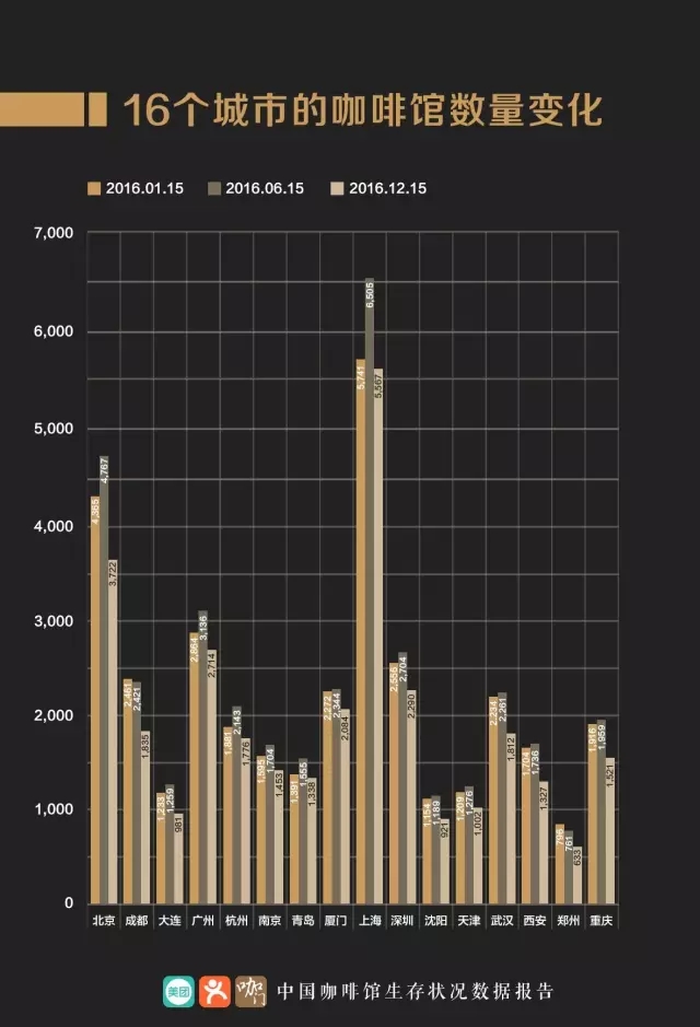 数据采样说明:数据提取自美团点评上收录的2016年1月15日、2016年6月15日、2016年12月15日3个时间节点;北京、上海、广州、深圳4个一线城市和天津、重庆、沈阳、南京、武汉、成都、西安、杭州、青岛、郑州、厦门、大连12个重点城市的咖啡数据。