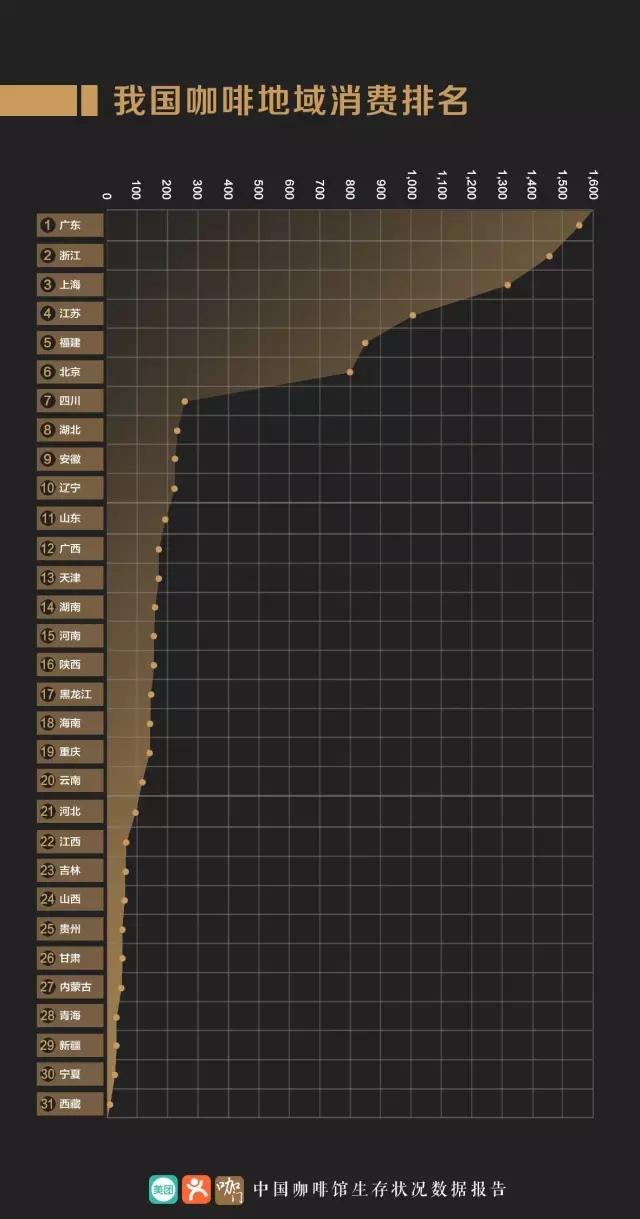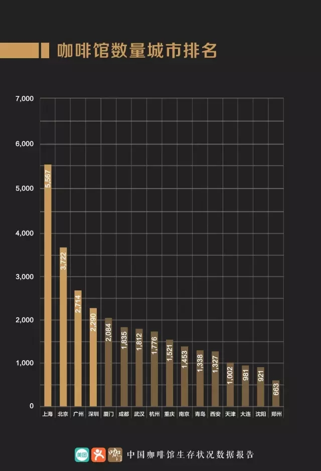 3、北上广深4个超一线城市咖啡馆数量,占全国总量的15.7%。