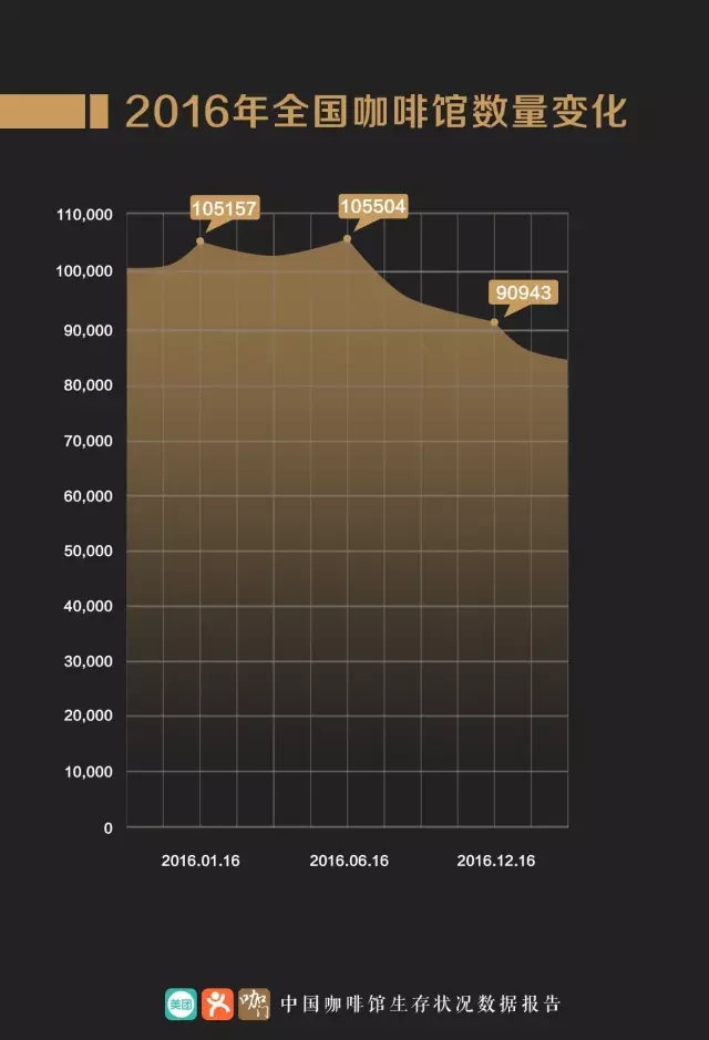 全国咖啡馆突破10W数量,2016年全年负增长,下半年行业出现新一轮洗牌。