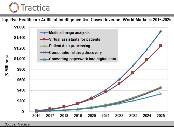 Tractica预测,2025年21个重点医疗保健AI使用案例的全球软件收入将从2017年的1.65亿美元增长到56亿美元,包括硬件和服务销售。预计到2025年,医疗保健AI市场将达到193亿美元。
