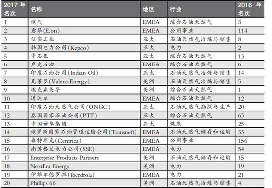印度信实工业有限公司排名从去年的第8升至第3,韩国电力公社排名从去年的第2降至第4,中国石油化工股份有限公司(简称中国石化)排名从去年的第13升至第5。