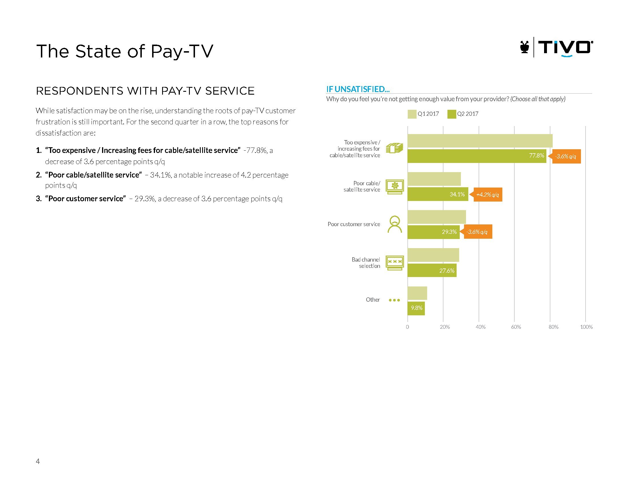 在收看付费电视的观众中,近半数使用的是每月$51-100的服务(47.5%),还有1/3使用的是每月$101以上的服务(36.2%)。半数消费者(52.9%)对当前的付费电视感到满意,还有1/3的消费者非常满意(31.2%)。不满意的原因包括,太贵或涨价(77.8%);糟糕的服务(34.1%);以及客户服务很差(29.3%)。