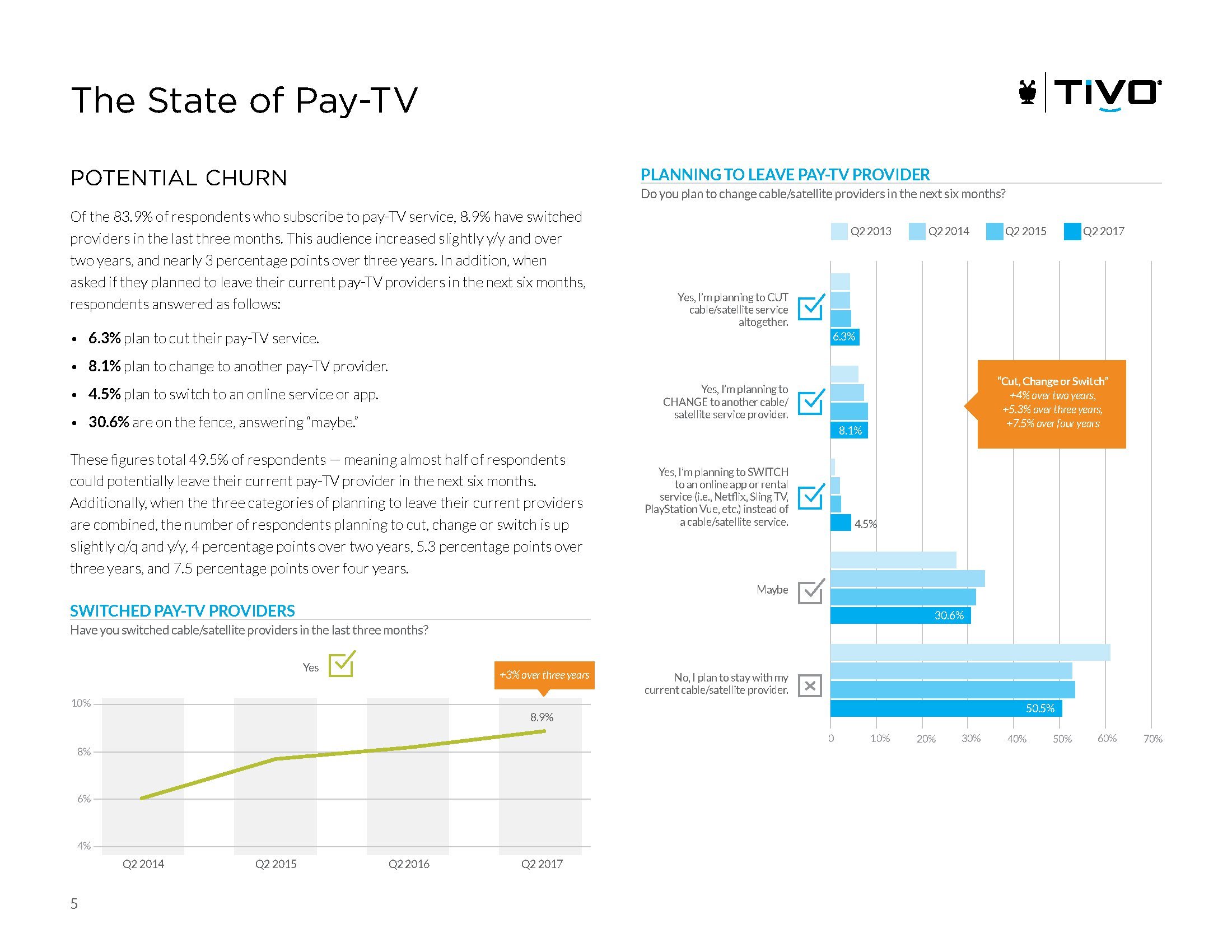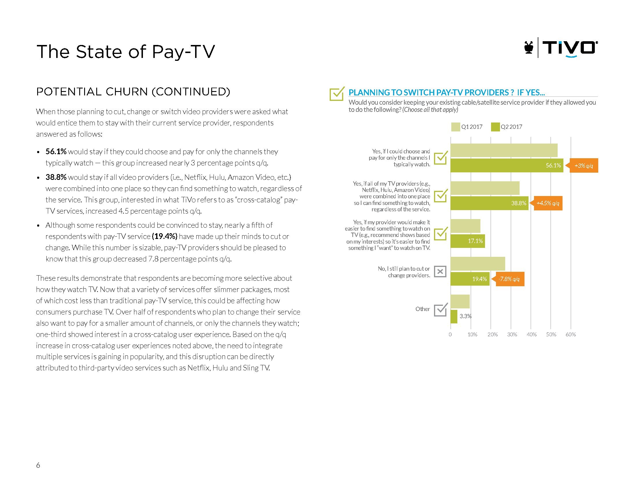 TiVo还调查了付费电视用户在未来六个月的动向,6.3%的观众计划退订付费电视;8.1%的消费者计划使用另一家付费电视提供商;4.5%的受访者计划改为收看流媒体;还有30.6%的受访者表示不确定。