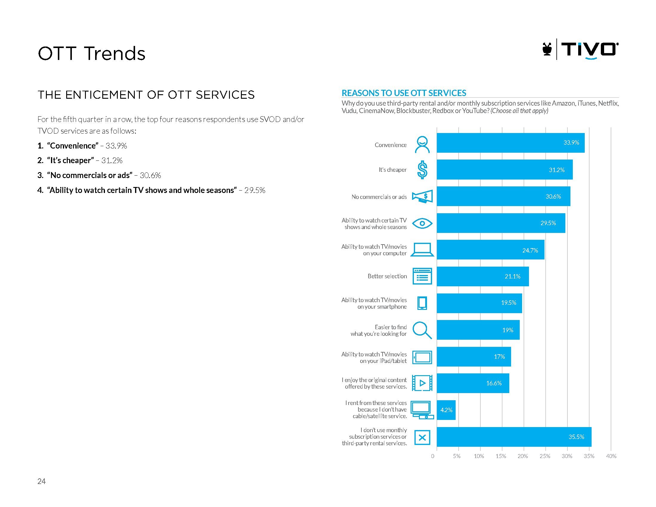 便利(33.9%)、便宜(31.2%)、没广告(30.6%)和可以收看特定电视节目或整季(29.5%)则是SVOD和TVOD受欢迎的原因。