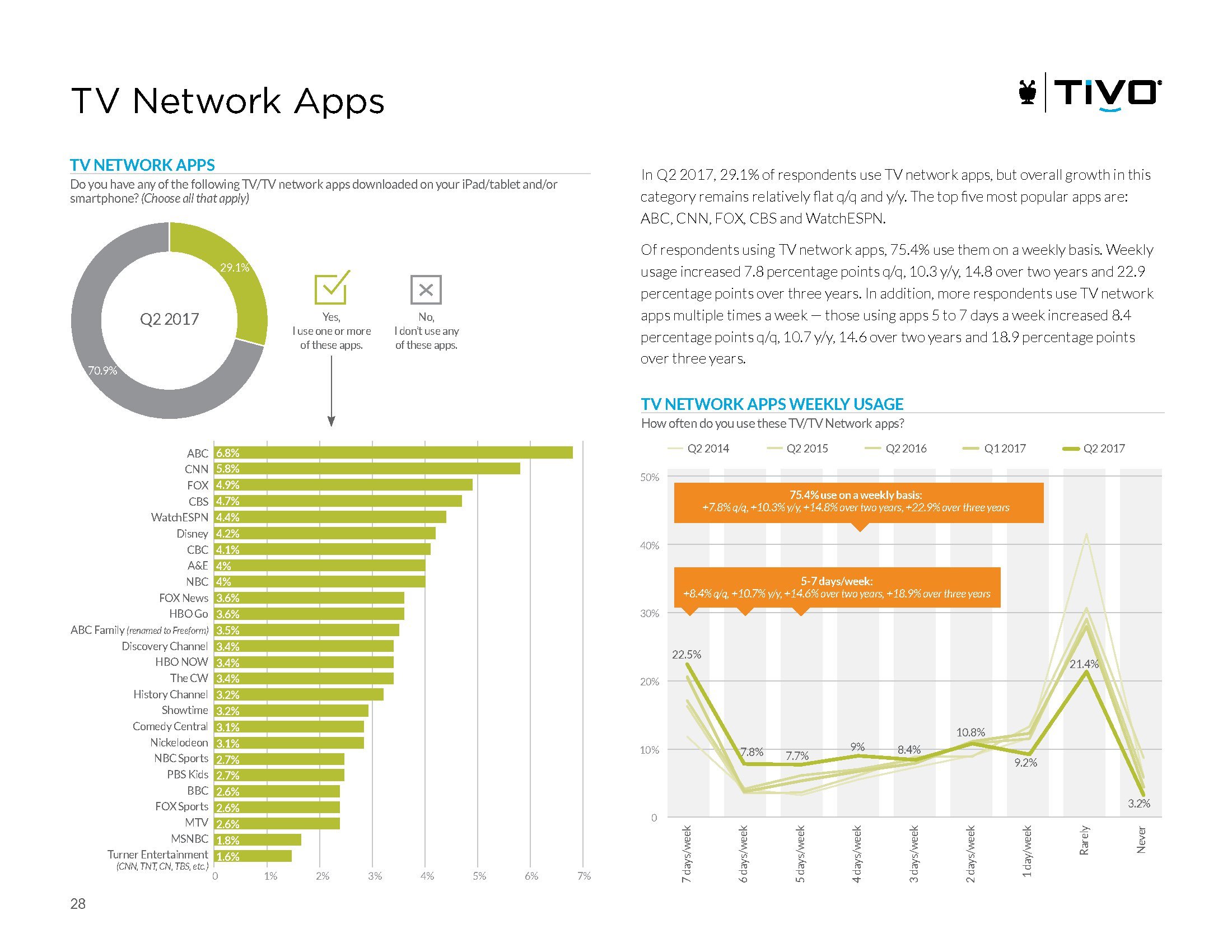 第二季度,29.1%的受访者在使用电视网络应用,总体增长平稳。最受欢迎的应用包括ABC,CNN,FOX,CBS和WatchESPN。75.4%的电视网络用户每周访问至少一次。
