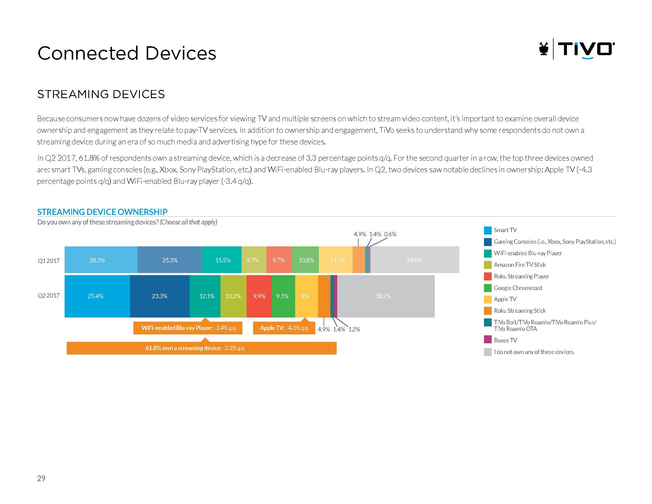 第二季度,61.8%的受访者拥有一部流媒体设备,最受欢迎的是智能电视、游戏主机和支持WiFi的蓝光播放器。