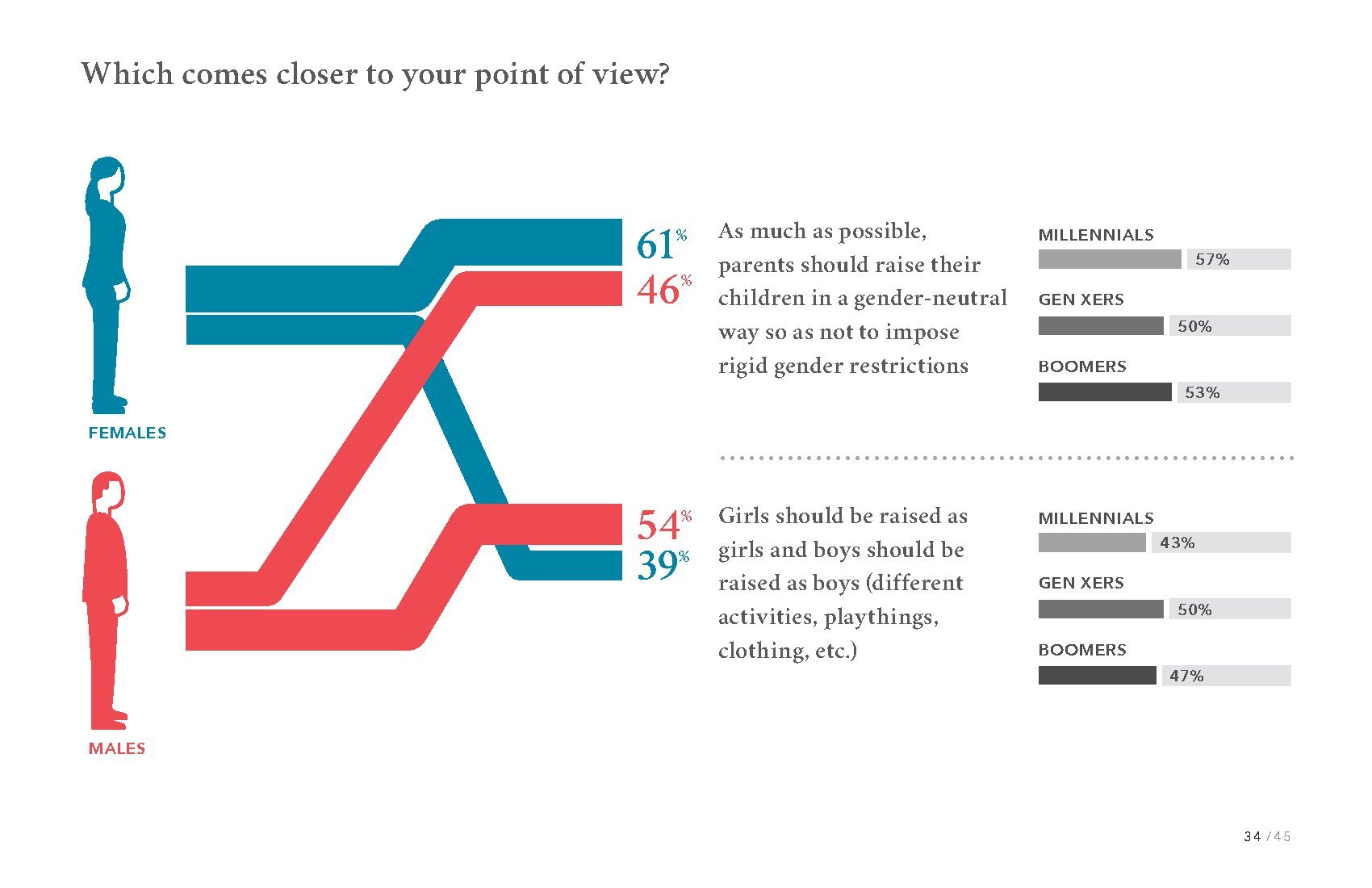 61%的女性认为,父母应以性别中立的方式来抚养子女,而不是通过传统的性别活动和衣着来抚养子女;