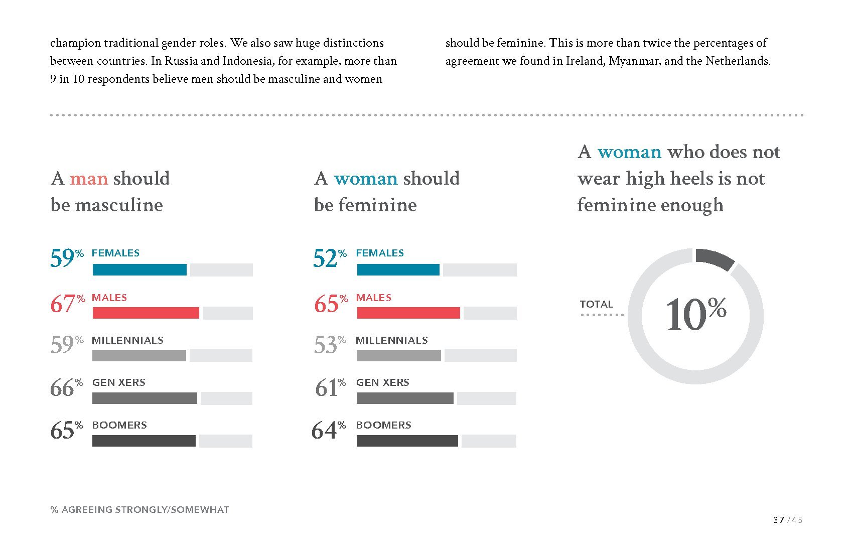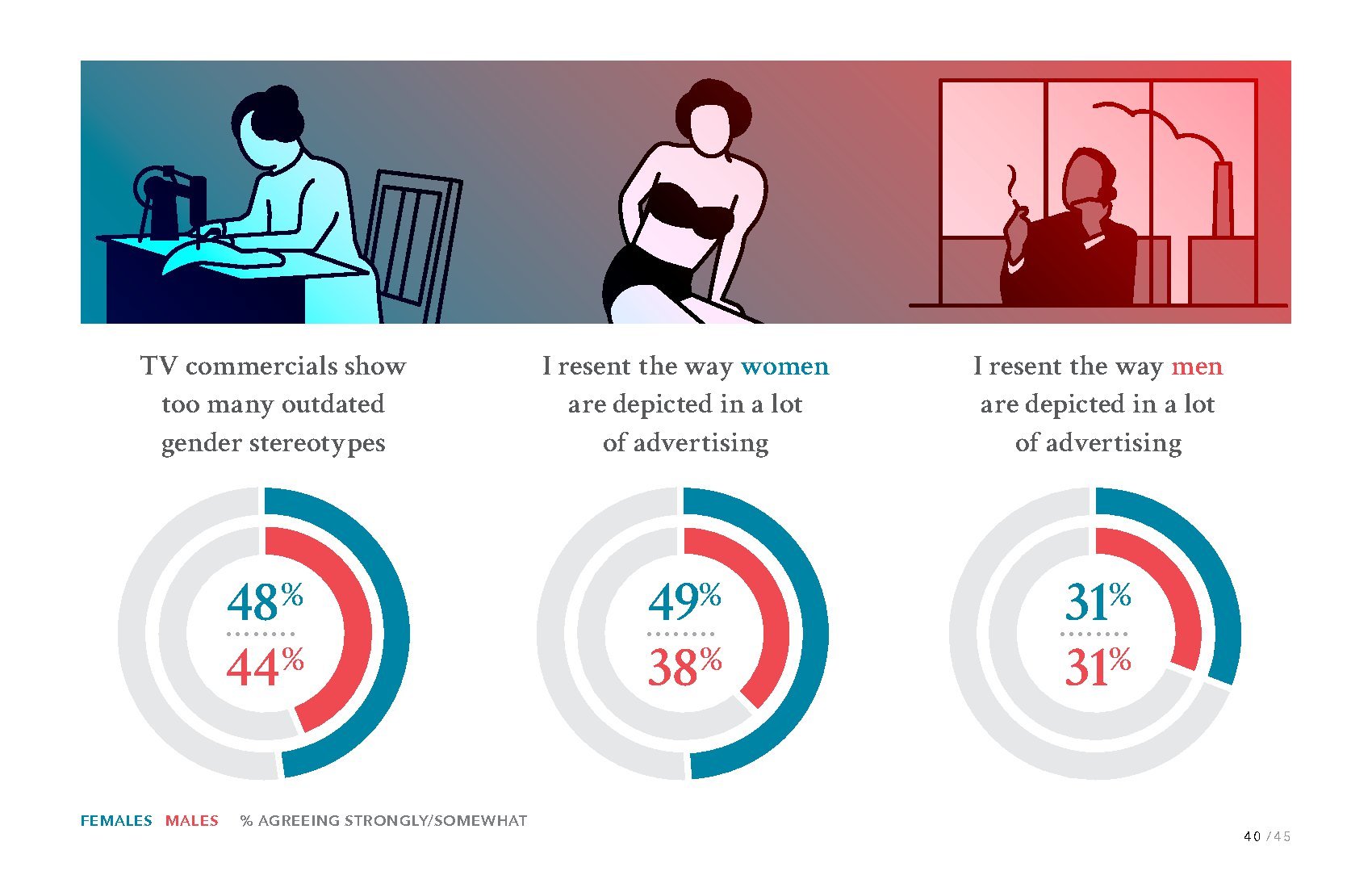 Havas Group调查了全球32个国家的12,168名成年人,男性也有相似的想法。44%的男性受访者认为电视广告使用的性别观念已经过时,4/10对广告中描绘的女性形象感到愤怒。