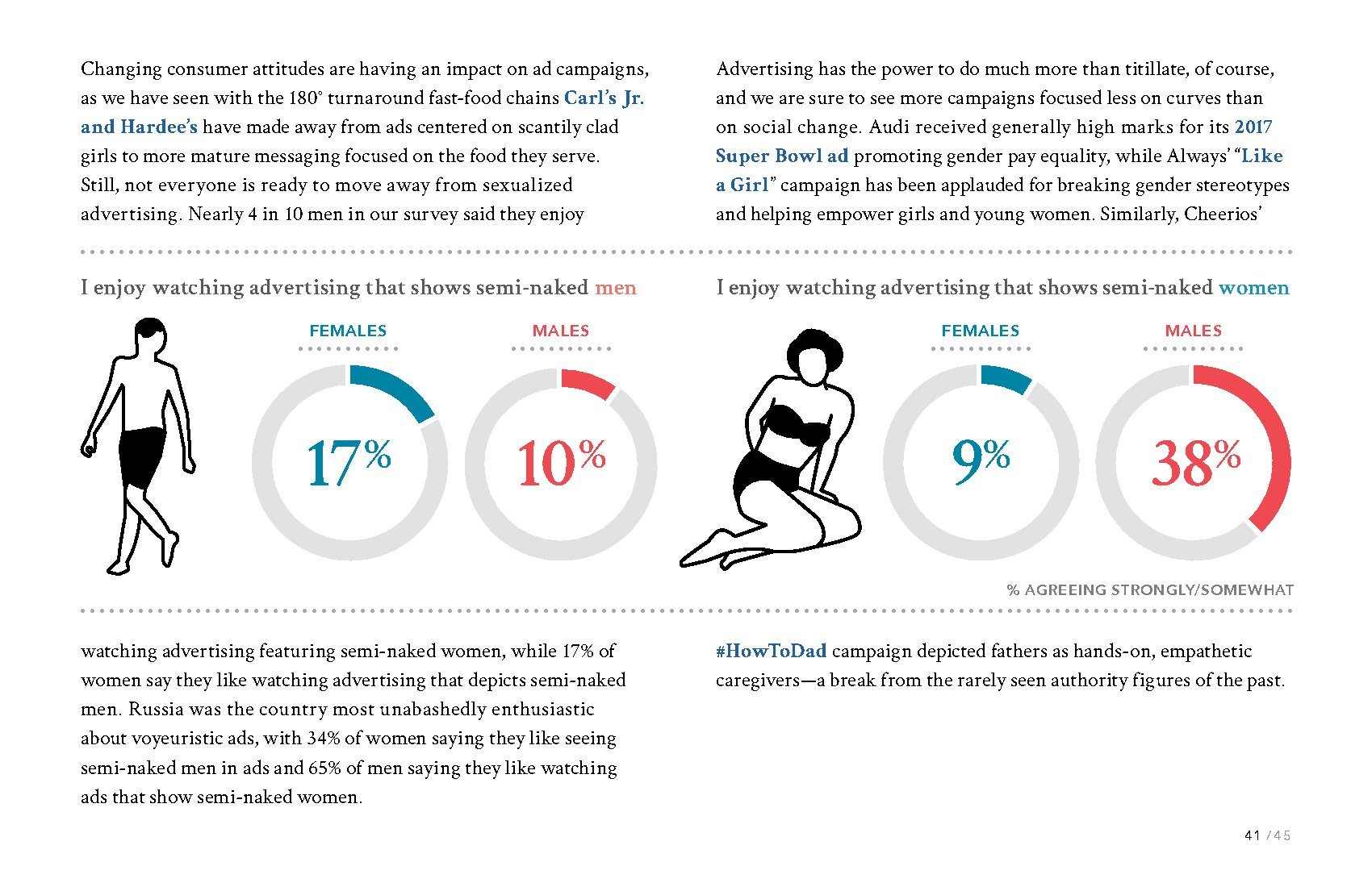 但是,在“偷窥”方面,男性更喜欢。38%男性喜欢观看有半裸女性的广告;相比之下,只有17%的女性喜欢看有半裸男性的广告。