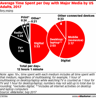 尽管如此,电视仍然是美国成年人最耗时的传统媒介。格式将占今年每日时间3小时58分钟;然而,从2016年下降了7分钟,也低于eMarketer以前发布的4小时19分钟的预测。