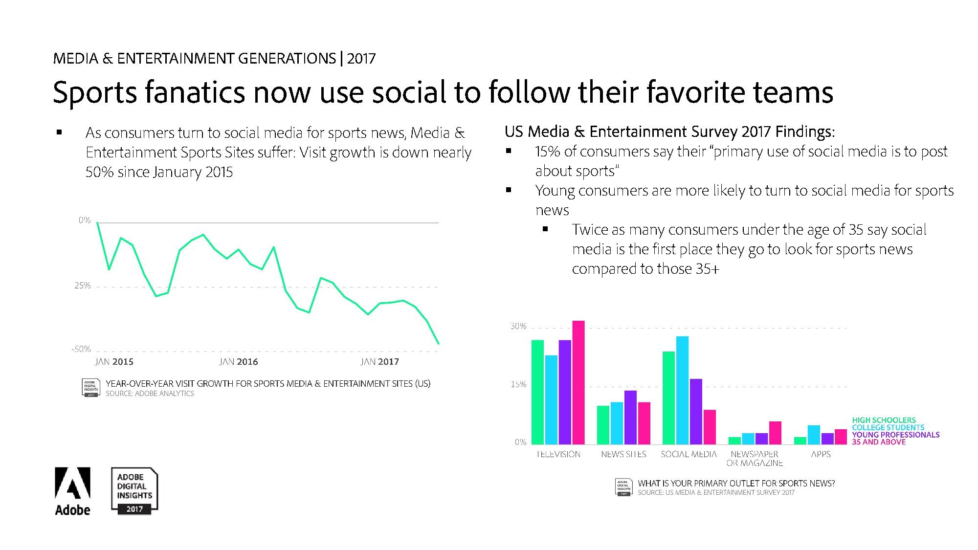 观众越来越喜欢在社交媒体上收看体育新闻,体育网站流量和2015年比下降近50%。Adobe的调查发现,15%的美国人将社交媒体作为分享体育内容的主要渠道,年轻人更是如此。