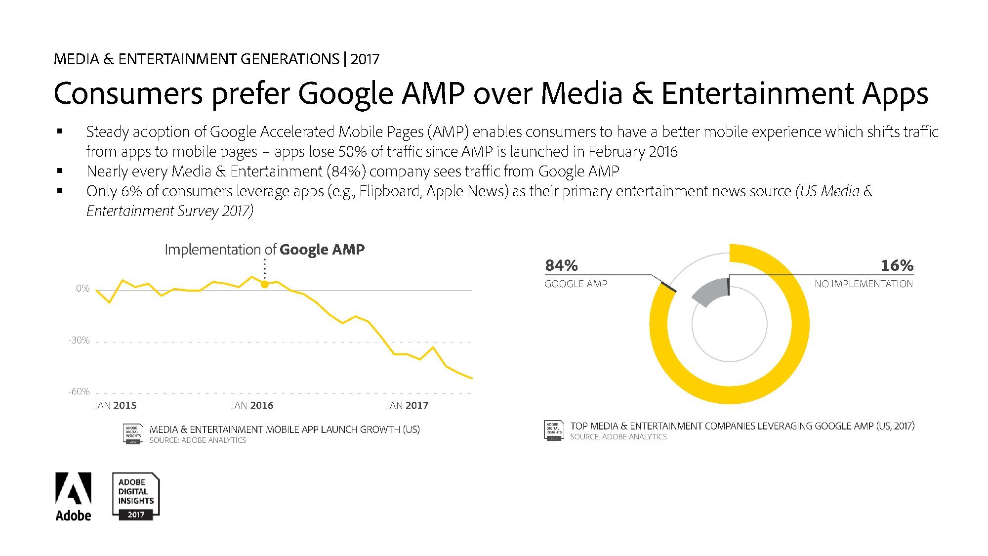 Google Accelerated Mobile Pages能提供更好的移动体验,因此吸引了更多流量。由于AMP,应用流量下降50%。84%的媒体和娱乐应用受到谷歌AMP的影响。