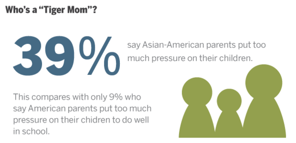 3)近40% 的人认为亚洲父母给孩子太大的压力。这么评价美国家长的只有9%。