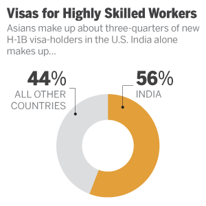 4)亚洲人拿走了75% 的H1B工作签证,其中印度人占了多一半。