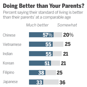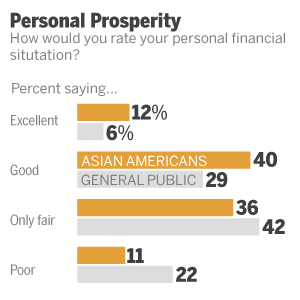 6)至于对自己目前经济状况和职业前景的满意度,跟美国大众比起来,亚裔自我感觉更好。