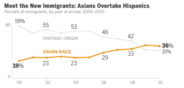 1)从移民的总数看,从2010 年开始,亚裔移民已经超过墨西哥人占到 36%。