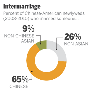 12)在结婚伴侣的选择上,65% 的华人还是选择了华人。9% 与其他亚洲人结婚,26% 的人与非亚裔结为伴侣。