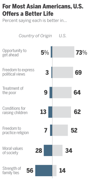 7)亚裔对美国的多个方面感到满意,但在道德价值观和家庭关系的紧密程度上,认为不如自己原来的国家。