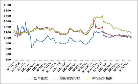 各车型指数波动幅度较小但均有不同程度回落,零担指数回落幅度高于整车指数,在零担指数中零担重货指数回落幅度高于零担轻货指数。其中,整车指数为1008.3点,比上周回落1.34%,比上年同期增长6.94%;零担轻货指数为1103.3点,环比回落1.38%;零担重货指数为1021.4点,环比回落0.73 %。