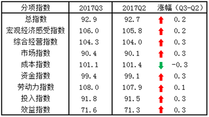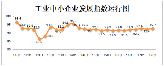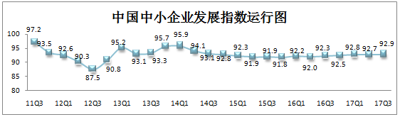 2017年三季度中国中小企业发展指数(SMEDI)为92.9,比上季度略升0.2点,升降幅度不大的特点持续6个季度。分行业指数5升2持平1降,分项指数7升1降,上升的面较上一季度有所扩大。中小企业发展指数继续保持平稳,向好的趋势有所增强,与宏观经济运行的总体特征大体一致。预计此种状况将维持下去。