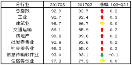 效益指数连续5个季度上升,但仍处于8个分项指数的最低位。其中除交通运输邮政仓储业、批发零售业、信息传输计算机服务软件业和住宿餐饮业指数分别下降0.2、0.1、0.3和0.3点,房地产业持平外,工业、建筑业和社会服务业指数分别上升0.5、0.2和0.4点。
