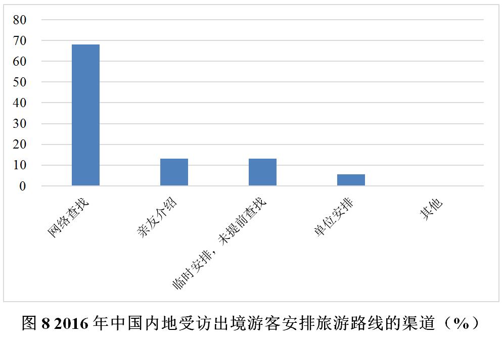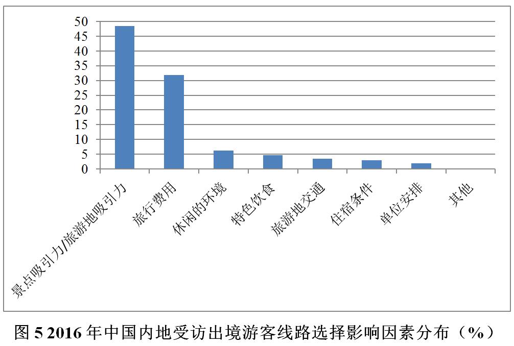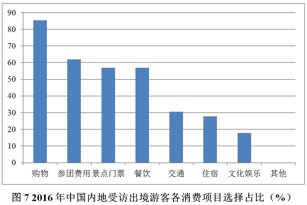 从目的地消费行为上看,中国游客的消费方式正在实现从“买买买”到“游游游”的理性转变。调查结果显示首次出境旅游的游客居多,游览观光和休闲度假是出境旅游的主要目的。对出游频率和决策重要程度的调查结果表明,出境旅游仍然是人们普遍难以决策的重大消费选择。女性市场明显高于男性市场,出境游客大都是和家人或朋友一起结伴而行,在选择境外旅游目的地时注重景点/旅游地的吸引力。多数游客愿意通过旅行社安排境外旅游活动,在选择旅行社时注重知名度和诚信度。选择半自助游、私家团的游客比例正在提升,说明中国游客不再满足于固定的路线与行程,对于弹性时间的要求正在增加。未参团的出境游客大都通过网络完成航班、酒店与旅游线路的预订。中高端群体占据主流,花费在5000-20000元之间的游客约占75%,游客青睐于选择中等价位酒店和经济型酒店。出境游花费的主要项目为购物、参团费用、餐饮和景点门票等。尽管购物仍然为花费最高的项目,但购物比重的收缩,反映出消费行为从“买买买”到“游游游”理性转变的迹象。