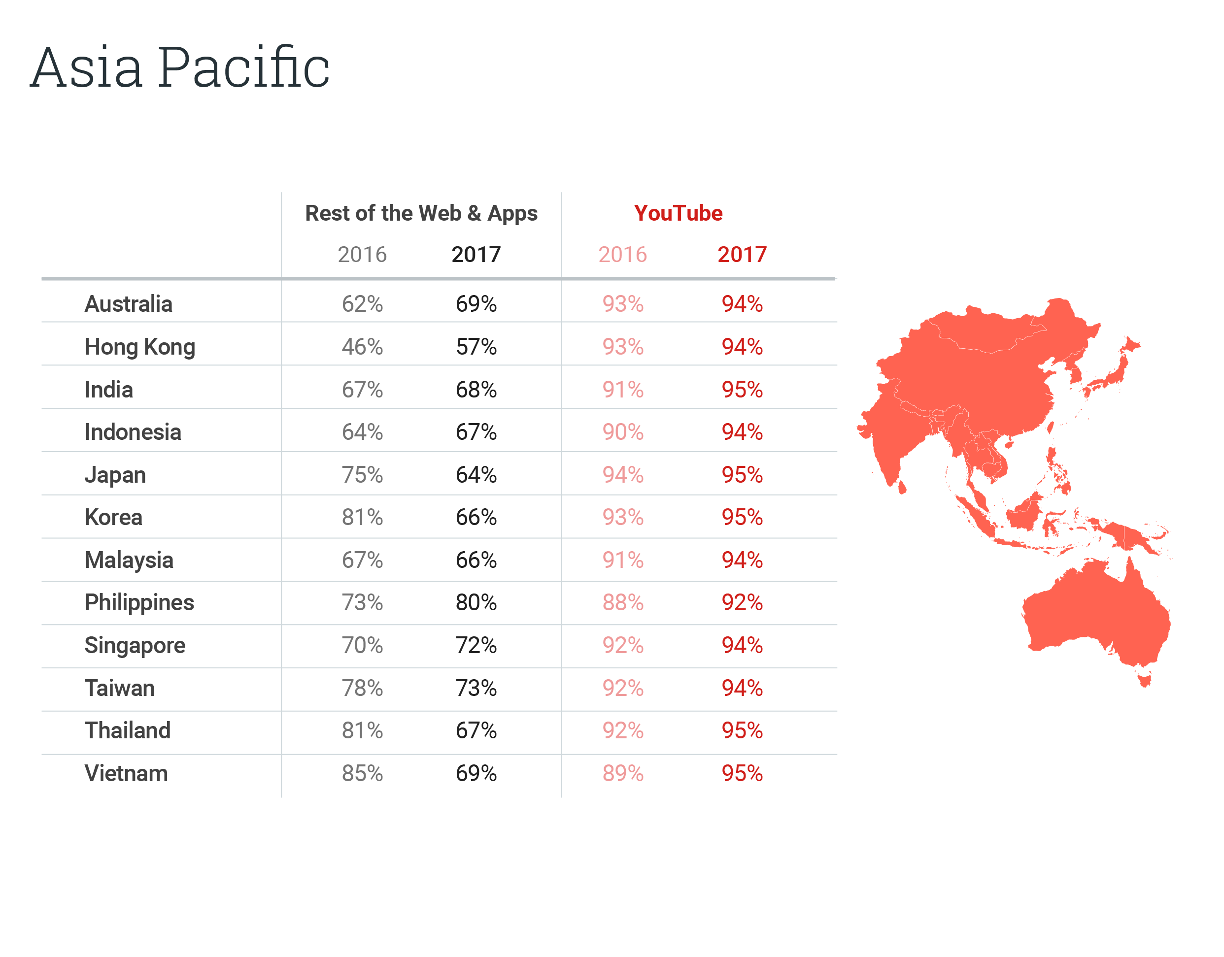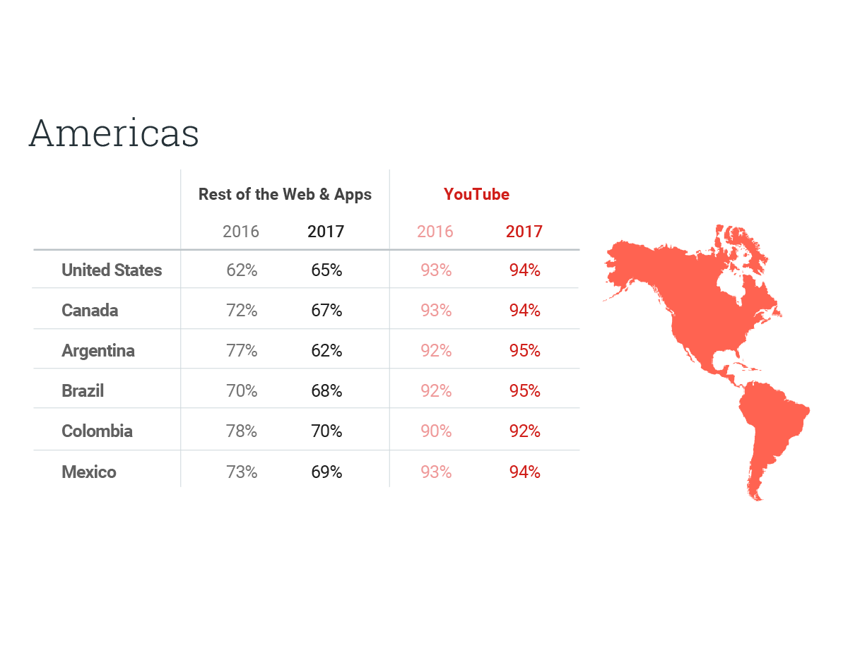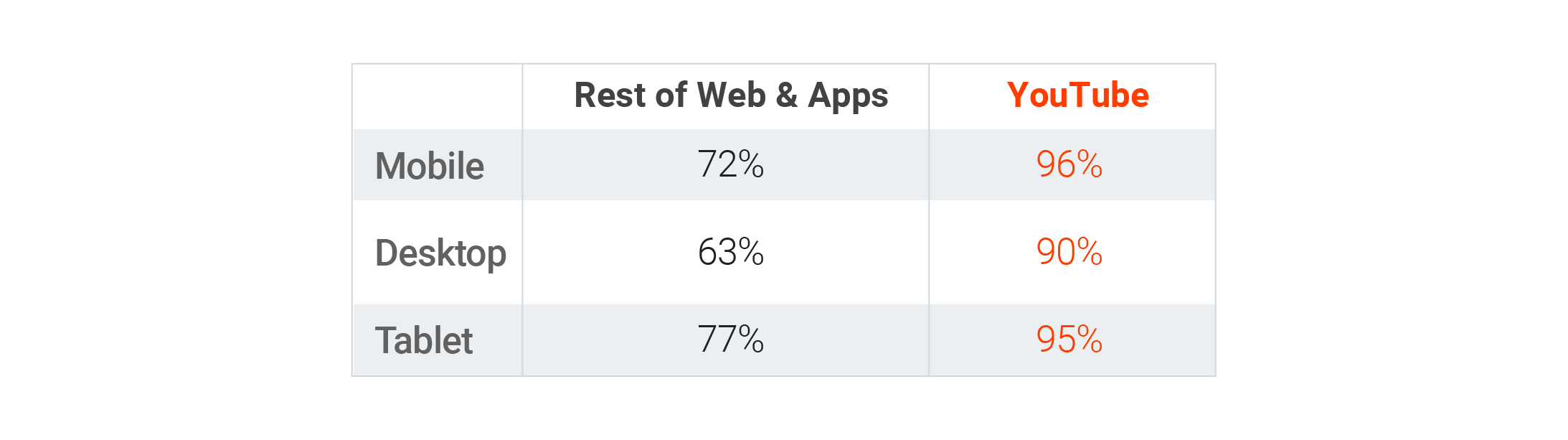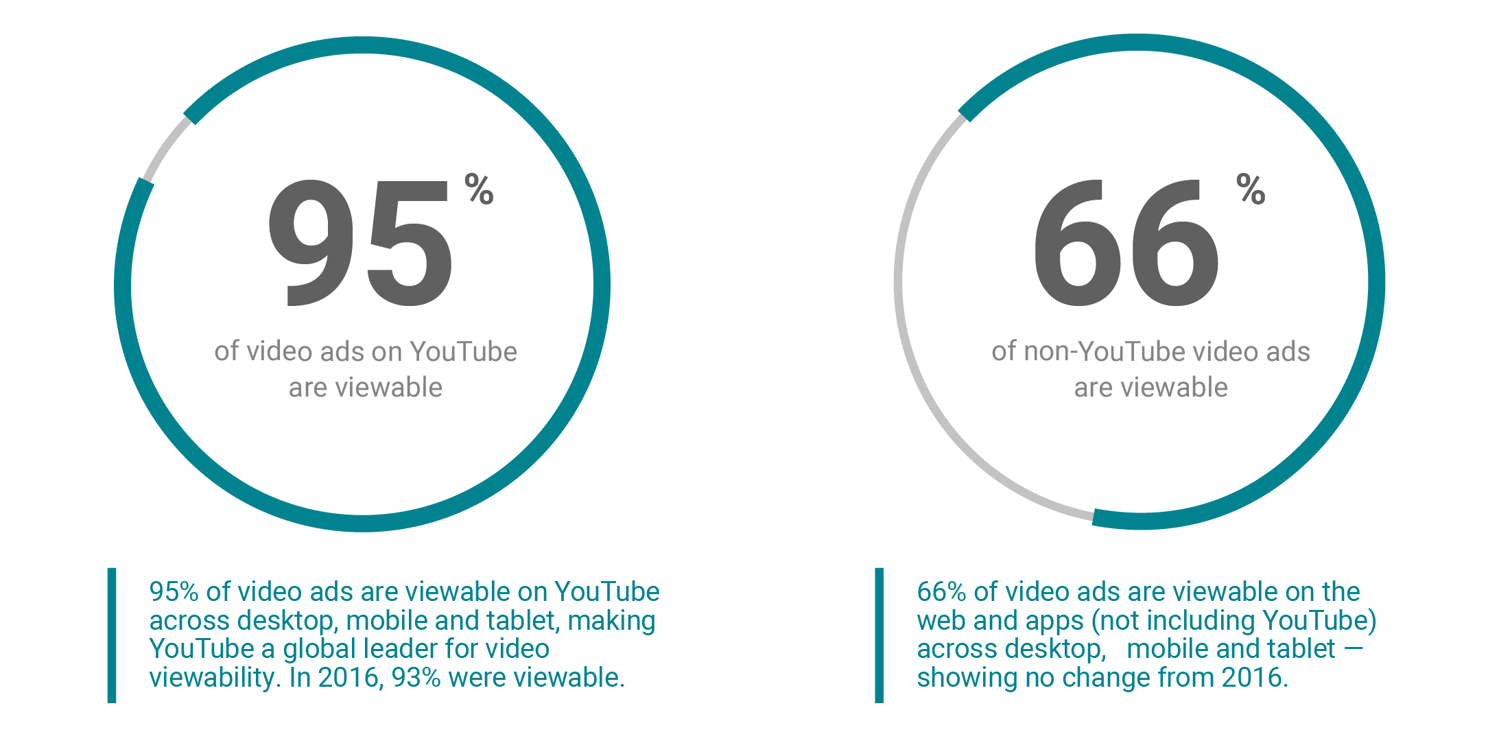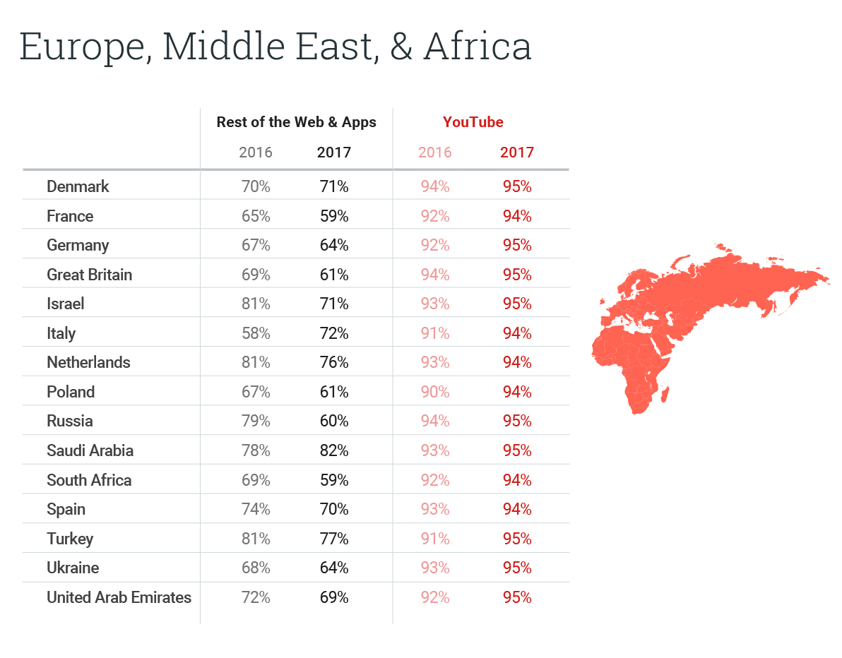 2017年,YouTube广告的可见度继续领先于其他平台,全球YouTube广告的平均可见度上升至95%,和2016年比增长2个百分点。其他网络和应用中,视频广告的平均可见度只有66%。从整体来看,手机和平板电脑的可见率仍然是最高的。不过,各国视频广告的可见度差异较大。