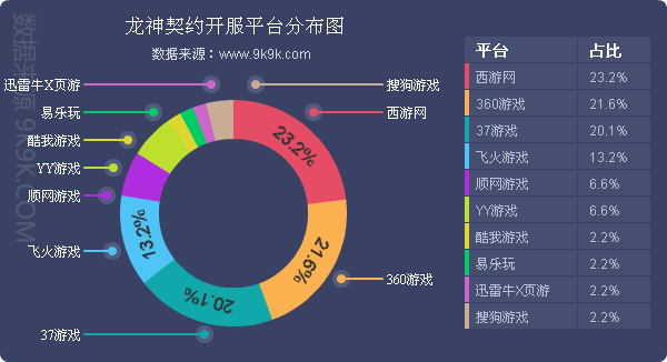 点评:本周《龙神契约》开服总数较上周减少了2.3%,其在西游网的开服占比被进一步稀释,并在酷我游戏、易乐玩等多家一线平台保持着1服/天的开服频率。