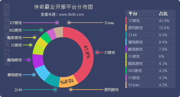 点评:本周《传奇霸业》开服总数基本未发生变化,各平台分布占比也较为稳定,其在酷我游戏、602游戏等多家一线平台的开服频率稳定在1服/天。