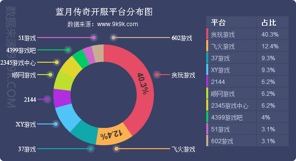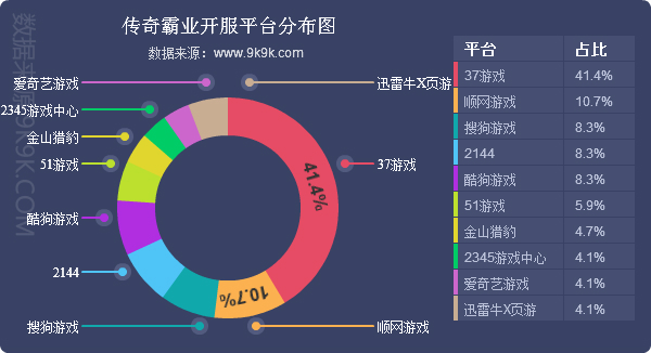 点评:本周《传奇霸业》开服总数略有减少,其在各平台开服情况基本未发生变化,新增分布占比平台2345游戏中心、爱奇艺游戏、迅雷牛X页游。
