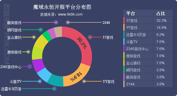 点评:《魔域永恒》本周开服总数同样略有增涨,其在斗鱼TV的开服占比升至7.6%,另外在顺网游戏等多家平台的开服频率稳定在1服/天。