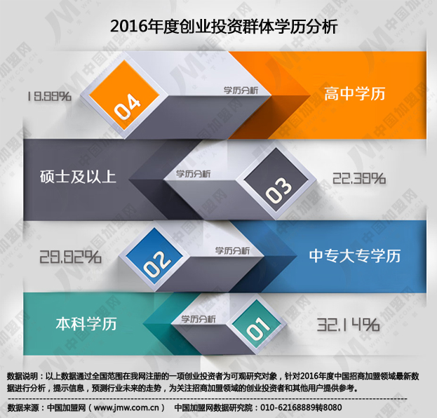 根据中国加盟网数据研究院数据显示,2016年,在创业投资群体的学历调查分析中得出,本科科学历占32.14%,中专及大专学历占据28.82%,硕士及硕士以上学历人群占22.38%,高中学历人群占18.88%。与去年同期相比,高学历的创业投资群体出现了高速增长,总比例超过半成。