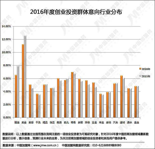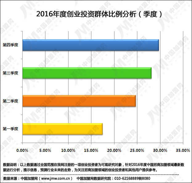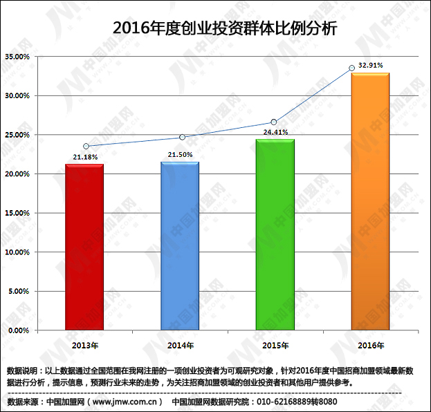 根据中国加盟网数据研究院数据显示,2016年全年关注招商加盟领域的创业者,同比增长24个百分点,创近四年来历史新高。2016年,国家全面实施创新驱动发展战略、进一步推进大众创业万众创新,增强了全民参与创业的信心,因此2016年创业创新已经进入提质增效的新阶段。